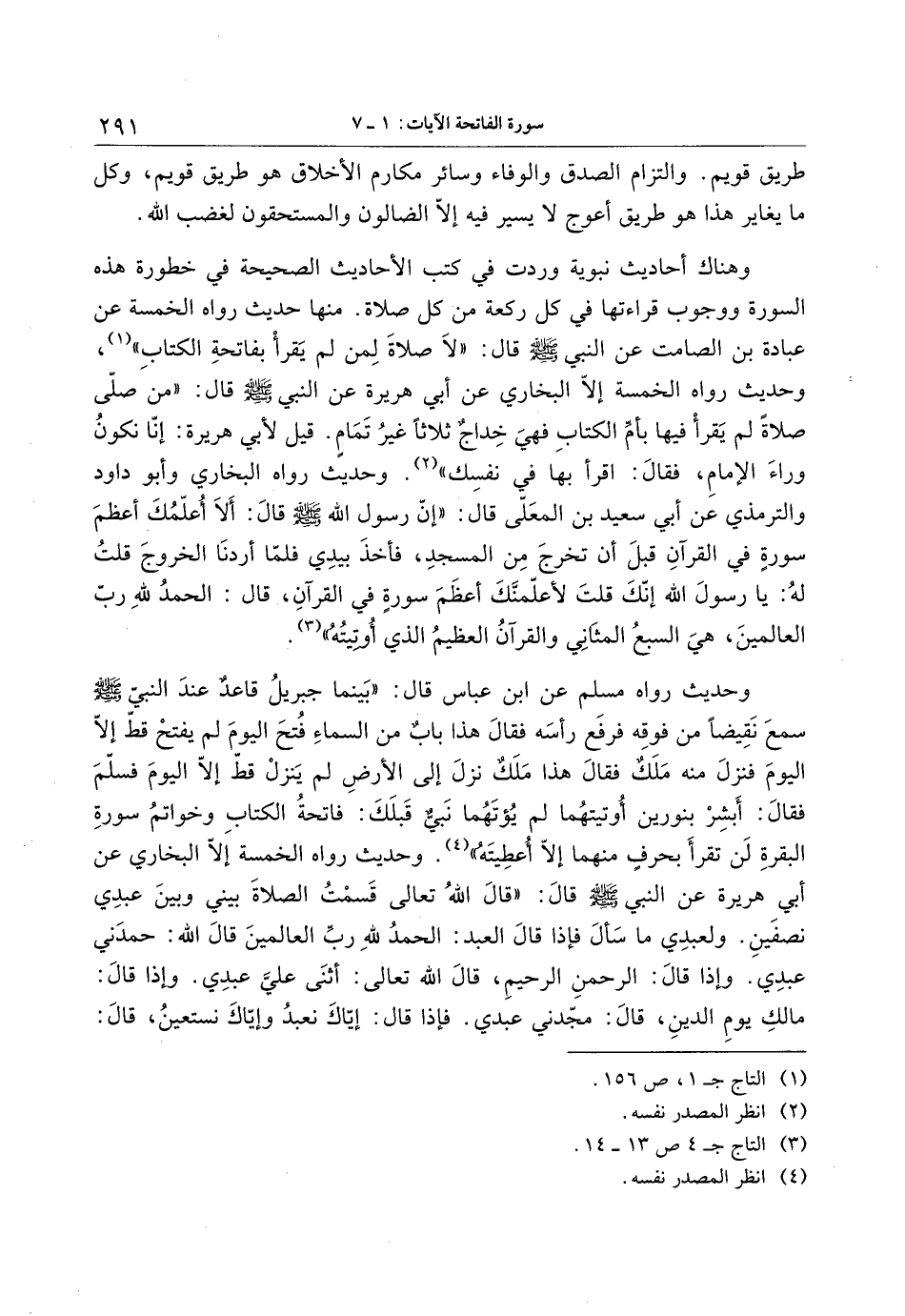 وهناك أحاديث نبوية وردت في كتب الأحاديث الصحيحة في خطورة هذه السورة ووجوب قراءتها في كل ركعة من كل صلاة. منها حديث رواه الخمسة عن عبادة بن الصامت عن النبي صلّى الله عليه وسلّم قال: «لا صلاة لمن لم يقرأ بفاتحة الكتاب» «1» ، وحديث رواه الخمسة إلّا البخاري عن أبي هريرة عن النبي صلّى الله عليه وسلّم قال: «من صلّى صلاة لم يقرأ فيها بأمّ الكتاب فهي خداج ثلاثا غير تمام. قيل لأبي هريرة: إنّا نكون وراء الإمام، فقال: اقرأ بها في نفسك» «2» . وحديث رواه البخاري وأبو داود والترمذي عن أبي سعيد بن المعلّى قال: «إنّ رسول الله صلّى الله عليه وسلّم قال: ألا أعلّمك أعظم سورة في القرآن قبل أن تخرج من المسجد، فأخذ بيدي فلمّا أردنا الخروج قلت له: يا رسول الله إنّك قلت لأعلّمنّك أعظم سورة في القرآن، قال: الحمد لله ربّ العالمين، هي السبع المثاني والقرآن العظيم الذي أوتيته» «3» .