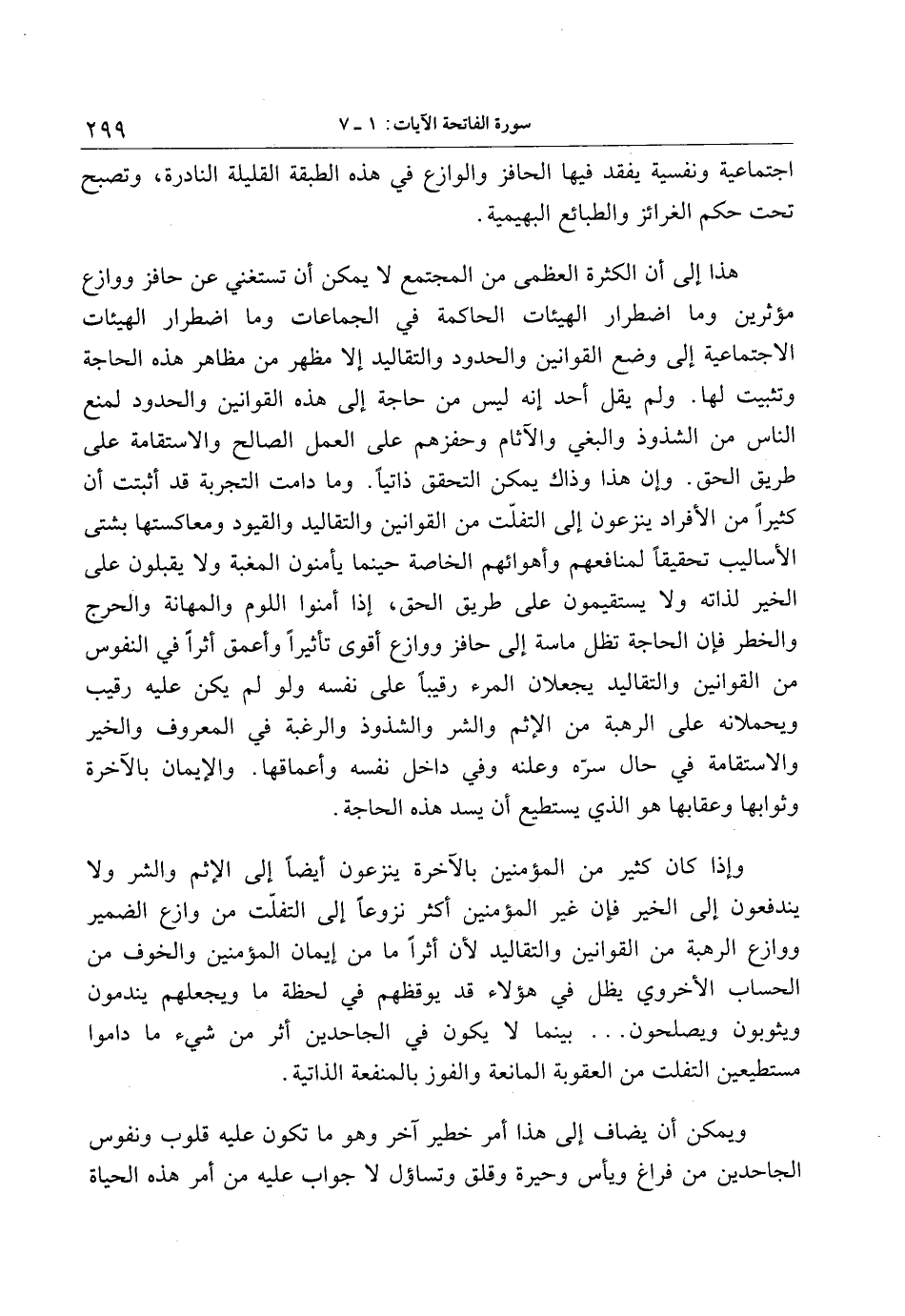 هذا إلى أن الكثرة العظمى من المجتمع لا يمكن أن تستغني عن حافز ووازع مؤثرين وما اضطرار الهيئات الحاكمة في الجماعات وما اضطرار الهيئات الاجتماعية إلى وضع القوانين والحدود والتقاليد إلا مظهر من مظاهر هذه الحاجة وتثبيت لها. ولم يقل أحد إنه ليس من حاجة إلى هذه القوانين والحدود لمنع الناس من الشذوذ والبغي والآثام وحفزهم على العمل الصالح والاستقامة على طريق الحق. وإن هذا وذاك يمكن التحقق ذاتيا. وما دامت التجربة قد أثبتت أن كثيرا من الأفراد ينزعون إلى التفلّت من القوانين والتقاليد والقيود ومعاكستها بشتى الأساليب تحقيقا لمنافعهم وأهوائهم الخاصة حينما يأمنون المغبة ولا يقبلون على الخير لذاته ولا يستقيمون على طريق الحق، إذا أمنوا اللوم والمهانة والحرج والخطر فإن الحاجة تظل ماسة إلى حافز ووازع أقوى تأثيرا وأعمق أثرا في النفوس من القوانين والتقاليد يجعلان المرء رقيبا على نفسه ولو لم يكن عليه رقيب ويحملانه على الرهبة من الإثم والشر والشذوذ والرغبة في المعروف والخير والاستقامة في حال سرّه وعلنه وفي داخل نفسه وأعماقها. والإيمان بالآخرة وثوابها وعقابها هو الذي يستطيع أن يسد هذه الحاجة.