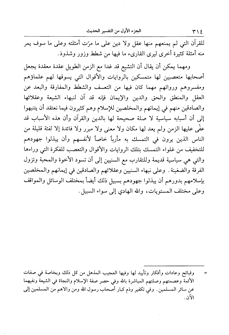 ومهما يمكن أن يقال أن التشيع قد غدا مع الزمن الطويل عقدة معقدة يجعل أصحابها متعصبين لها متمسكين بالروايات والأقوال التي يسوقها لهم علماؤهم ومفسروهم ورواتهم مهما كان فيها من التعسف والشطط والمفارقة والبعد عن العقل والمنطق والحق والدين والإيمان فإنه قد آن لنبهاء الشيعة وعقلائها والصادقين منهم في إيمانهم والمخلصين للإسلام وهم كثيرون فيما نعتقد أن يتنبهوا إلى أن أسبابه سياسية لا صلة صحيحة لها بالدين والقرآن وأن هذه الأسباب قد عفّى عليها الزمن ولم يعد لها مكان ولا معنى ولا مبرر ولا فائدة إلا لفئة قليلة من الناس الذين يرون في التمسك به مأربا خاصا لأنفسهم وأن يبذلوا جهودهم للتخفيف من غلواء التمسك بتلك الروايات والأقوال والتعصب للفكرة التي وراءها والتي هي سياسية قديمة وللتقارب مع السنيين إلى أن تسود الأخوة والمحبة وتزول الفرقة والضغينة. وعلى نبهاء السنيين وعقلائهم والصادقين في إيمانهم والمخلصين بإسلامهم بدورهم أن يبذلوا جهودهم بسبيل ذلك أيضا بمختلف الوسائل والمواقف وعلى مختلف المستويات، والله الهادي إلى سواء السبيل.