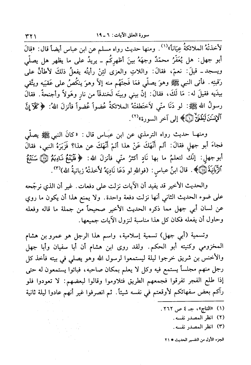 والحديث الأخير قد يفيد أن الآيات نزلت على دفعات. غير أن الذي نرجّحه على ضوء الحديث الثاني أنها نزلت دفعة واحدة. ولا يمنع هذا أن يكون ما روي عن لسان أبي جهل مما ذكره الحديث الأخير صحيحا من جملة ما قاله وفعله وحاول أن يفعله فكان كل هذا مناسبة لنزول الآيات جميعها.