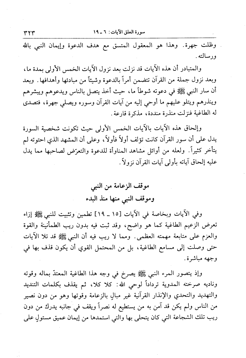 والمتبادر أن هذه الآيات قد نزلت بعد نزول الآيات الخمس الأولى بمدة ما، وبعد نزول جملة من القرآن تتضمن أمرا بالدعوة وشيئا من مبادئها وأهدافها. وبعد أن سار النبي صلّى الله عليه وسلّم في دعوته شوطا ما، حيث أخذ يتصل بالناس ويدعوهم ويبشرهم وينذرهم ويتلو عليهم ما أوحي إليه من آيات القرآن وسوره ويصلي جهرة، فتصدى له الطاغية فنزلت منذرة منددة، مذكرة قارعة.