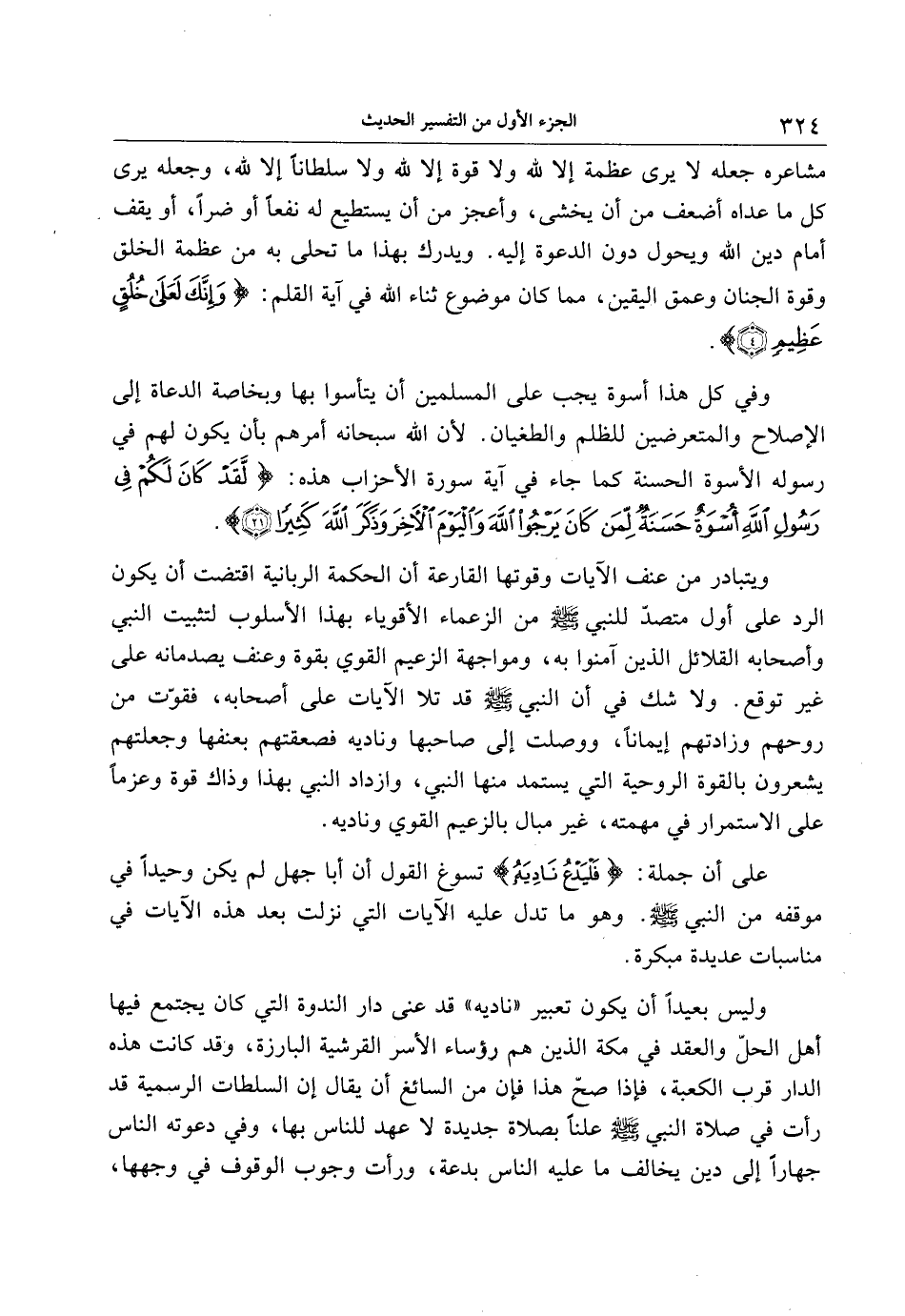 ويتبادر من عنف الآيات وقوتها القارعة أن الحكمة الربانية اقتضت أن يكون الرد على أول متصدّ للنبي صلّى الله عليه وسلّم من الزعماء الأقوياء بهذا الأسلوب لتثبيت النبي وأصحابه القلائل الذين آمنوا به، ومواجهة الزعيم القوي بقوة وعنف يصدمانه على غير توقع. ولا شك في أن النبي صلّى الله عليه وسلّم قد تلا الآيات على أصحابه، فقوّت من روحهم وزادتهم إيمانا، ووصلت إلى صاحبها وناديه فصعقتهم بعنفها وجعلتهم يشعرون بالقوة الروحية التي يستمد منها النبي، وازداد النبي بهذا وذاك قوة وعزما على الاستمرار في مهمته، غير مبال بالزعيم القوي وناديه.