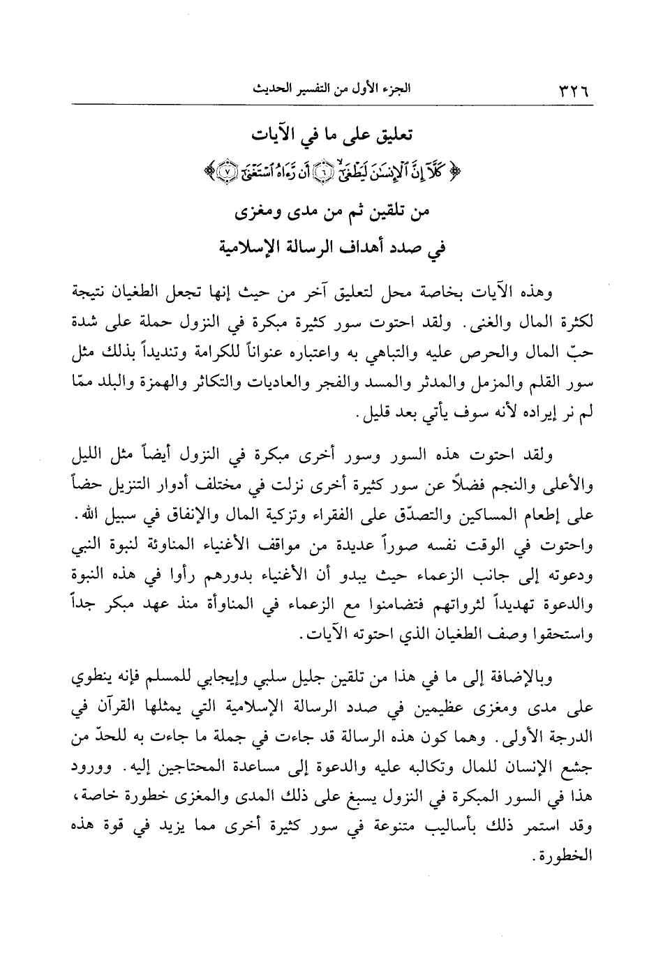 (7) من تلقين ثم من مدى ومغزى في صدد أهداف الرسالة الإسلامية وهذه الآيات بخاصة محل لتعليق آخر من حيث إنها تجعل الطغيان نتيجة لكثرة المال والغنى. ولقد احتوت سور كثيرة مبكرة في النزول حملة على شدة حبّ المال والحرص عليه والتباهي به واعتباره عنوانا للكرامة وتنديدا بذلك مثل سور القلم والمزمل والمدثر والمسد والفجر والعاديات والتكاثر والهمزة والبلد ممّا لم نر إيراده لأنه سوف يأتي بعد قليل.