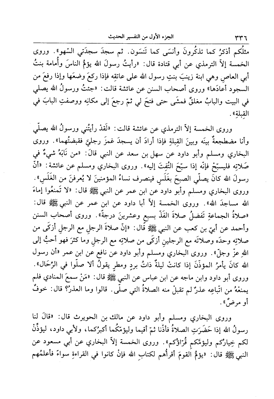 وروى الخمسة إلّا الترمذي عن عائشة قالت: «لقد رأيتني ورسول الله يصلّي وأنا مضطجعة بينه وبين القبلة فإذا أراد أن يسجد غمز رجليّ فقبضتهما» . وروى البخاري ومسلم وأبو داود عن سهل بن سعد عن النبي قال: «من نابه شيء في صلاته فليسبّح فإنّه إذا سبّح التفت إليه» . وروى البخاري ومسلم عن عائشة: «أنّ رسول الله كان يصلّي الصبح بغلس فينصرف نساء المؤمنين لا يعرفن من الغلس» .
