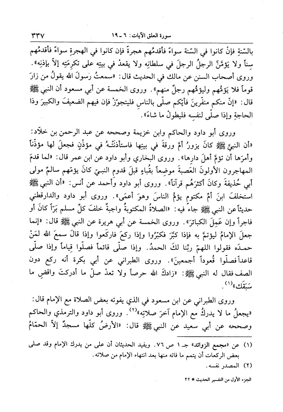 (1) عن «مجمع الزوائد» ج 1 ص 76. ويفيد الحديثان أن على من يدرك الإمام وقد صلى بعض الركعات أن يتمم ما فاته منها بعد انتهاء الإمام من صلاته.