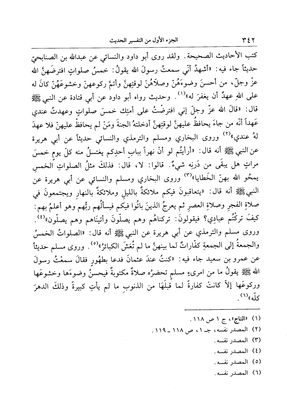 كتب الأحاديث الصحيحة. ولقد روى أبو داود والنسائي عن عبد الله بن الصنابحيّ حديثا جاء فيه: «أشهد أنّي سمعت رسول الله يقول: خمس صلوات افترضهنّ الله عزّ وجلّ، من أحسن وضوء هنّ وصلّاهنّ لوقتهنّ وأتمّ ركوعهنّ وخشوعهنّ كان له على الله عهد أن يغفر له» «1» . وحديث رواه أبو داود عن أبي قتادة عن النبي صلّى الله عليه وسلّم قال: «قال الله عزّ وجلّ إني افترضت على أمتك خمس صلوات وعهدت عندي عهدا أنّه من جاء يحافظ عليهنّ لوقتهنّ أدخلته الجنة ومن لم يحافظ عليهنّ فلا عهد له عندي» «2» وروى البخاري ومسلم والترمذي والنسائي حديثا عن أبي هريرة عن النبي صلّى الله عليه وسلّم أنه قال: «أرأيتم لو أنّ نهرا بباب أحدكم يغتسل منه كلّ يوم خمس مرات هل يبقى من درنه شيء. قالوا: لا، قال: فذلك مثل الصلوات الخمس يمحو الله بهنّ الخطايا» «3» وروى البخاري ومسلم والنسائي عن أبي هريرة عن النبي صلّى الله عليه وسلّم أنه قال: «يتعاقبون فيكم ملائكة بالليل وملائكة بالنهار ويجتمعون في صلاة الفجر وصلاة العصر ثم يعرج الذين باتوا فيكم فيسألهم ربّهم وهو أعلم بهم:
