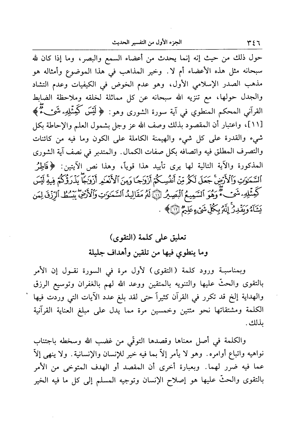 حول ذلك من حيث إنه إنما يحدث من أعضاء السمع والبصر، وما إذا كان لله سبحانه مثل هذه الأعضاء أم لا. وخير المذاهب في هذا الموضوع وأمثاله هو مذهب الصدر الإسلامي الأول، وهو عدم الخوض في الكيفيات وعدم التشاد والجدل حولها، مع تنزيه الله سبحانه عن كل مماثلة لخلقه وملاحظة الضابط القرآني المحكم المنطوي في آية سورة الشورى وهو: لَيْسَ كَمِثْلِهِ شَيْءٌ [11] ، واعتبار أن المقصود بذلك وصف الله عز وجل بشمول العلم والإحاطة بكل شيء والقدرة على كل شيء والهيمنة الكاملة على الكون وما فيه من كائنات والتصرف المطلق فيه واتصافه بكل صفات الكمال. والمتدبر في نصف آية الشورى المذكورة والآية التالية لها يرى تأييد هذا قويا، وهذا نص الآيتين: فاطِرُ السَّماواتِ وَالْأَرْضِ جَعَلَ لَكُمْ مِنْ أَنْفُسِكُمْ أَزْواجاً وَمِنَ الْأَنْعامِ أَزْواجاً يَذْرَؤُكُمْ فِيهِ لَيْسَ كَمِثْلِهِ شَيْءٌ وَهُوَ السَّمِيعُ الْبَصِيرُ (11) لَهُ مَقالِيدُ السَّماواتِ وَالْأَرْضِ يَبْسُطُ الرِّزْقَ لِمَنْ يَشاءُ وَيَقْدِرُ إِنَّهُ بِكُلِّ شَيْءٍ عَلِيمٌ (12) .