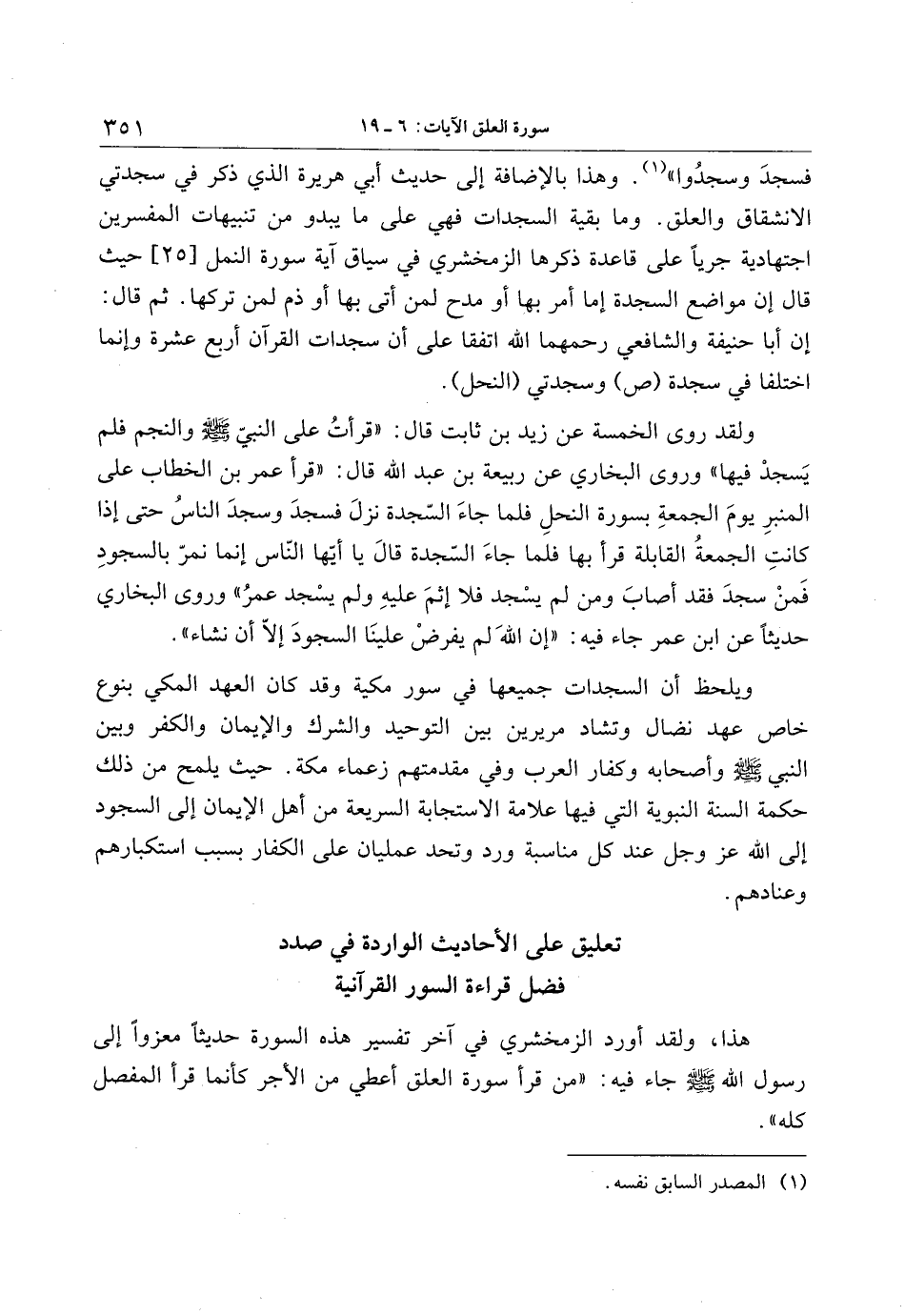 فسجد وسجدوا» «1» . وهذا بالإضافة إلى حديث أبي هريرة الذي ذكر في سجدتي الانشقاق والعلق. وما بقية السجدات فهي على ما يبدو من تنبيهات المفسرين اجتهادية جريا على قاعدة ذكرها الزمخشري في سياق آية سورة النمل [25] حيث قال إن مواضع السجدة إما أمر بها أو مدح لمن أتى بها أو ذم لمن تركها. ثم قال: