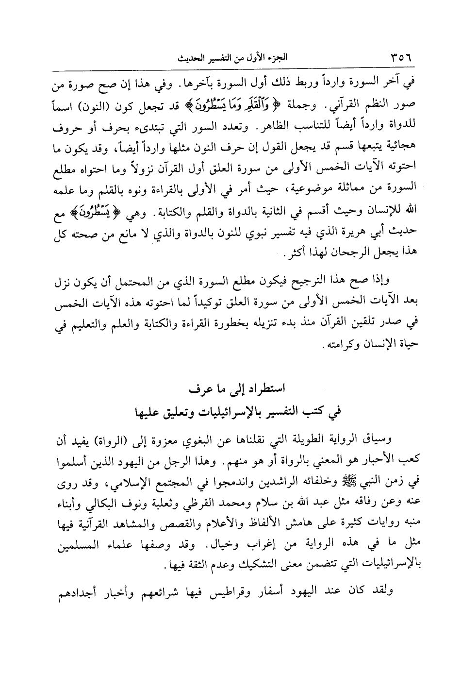 في آخر السورة واردا وربط ذلك أول السورة بآخرها. وفي هذا إن صح صورة من صور النظم القرآني. وجملة وَالْقَلَمِ وَما يَسْطُرُونَ قد تجعل كون (النون) اسما للدواة واردا أيضا للتناسب الظاهر. وتعدد السور التي تبتدئ بحرف أو حروف هجائية يتبعها قسم قد يجعل القول إن حرف النون مثلها واردا أيضا، وقد يكون ما احتوته الآيات الخمس الأولى من سورة العلق أول القرآن نزولا وما احتواه مطلع السورة من مماثلة موضوعية، حيث أمر في الأولى بالقراءة ونوه بالقلم وما علمه الله للإنسان وحيث أقسم في الثانية بالدواة والقلم والكتابة. وهي يَسْطُرُونَ مع حديث أبي هريرة الذي فيه تفسير نبوي للنون بالدواة والذي لا مانع من صحته كل هذا يجعل الرجحان لهذا أكثر.