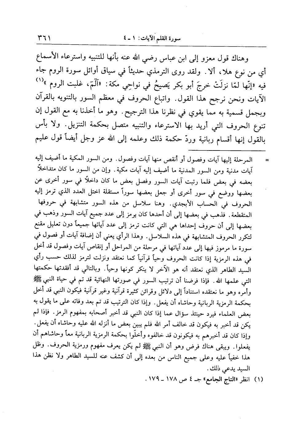 وهناك قول معزو إلى ابن عباس رضي الله عنه بأنها للتنبيه واسترعاء الأسماع أي من نوع هلا، ألا. ولقد روى الترمذي حديثا في سياق أوائل سورة الروم جاء فيه «إنّها لمّا نزلت خرج أبو بكر يصيح في نواحي مكة: «الم، غلبت الروم» «1» الآيات ونحن نرجح هذا القول. واتباع الحروف في معظم السور بالتنويه بالقرآن وبجمل قسمية به مما يقوي في نظرنا هذا الترجيح. وهو ما أخذنا به مع القول إن تنوع الحروف التي أريد بها الاسترعاء والتنبيه متصل بحكمة التنزيل. ولا بأس بالقول إنها أقسام ربانية وردّ حكمة ذلك وعلمه إلى الله عز وجل أيضا قول عليم