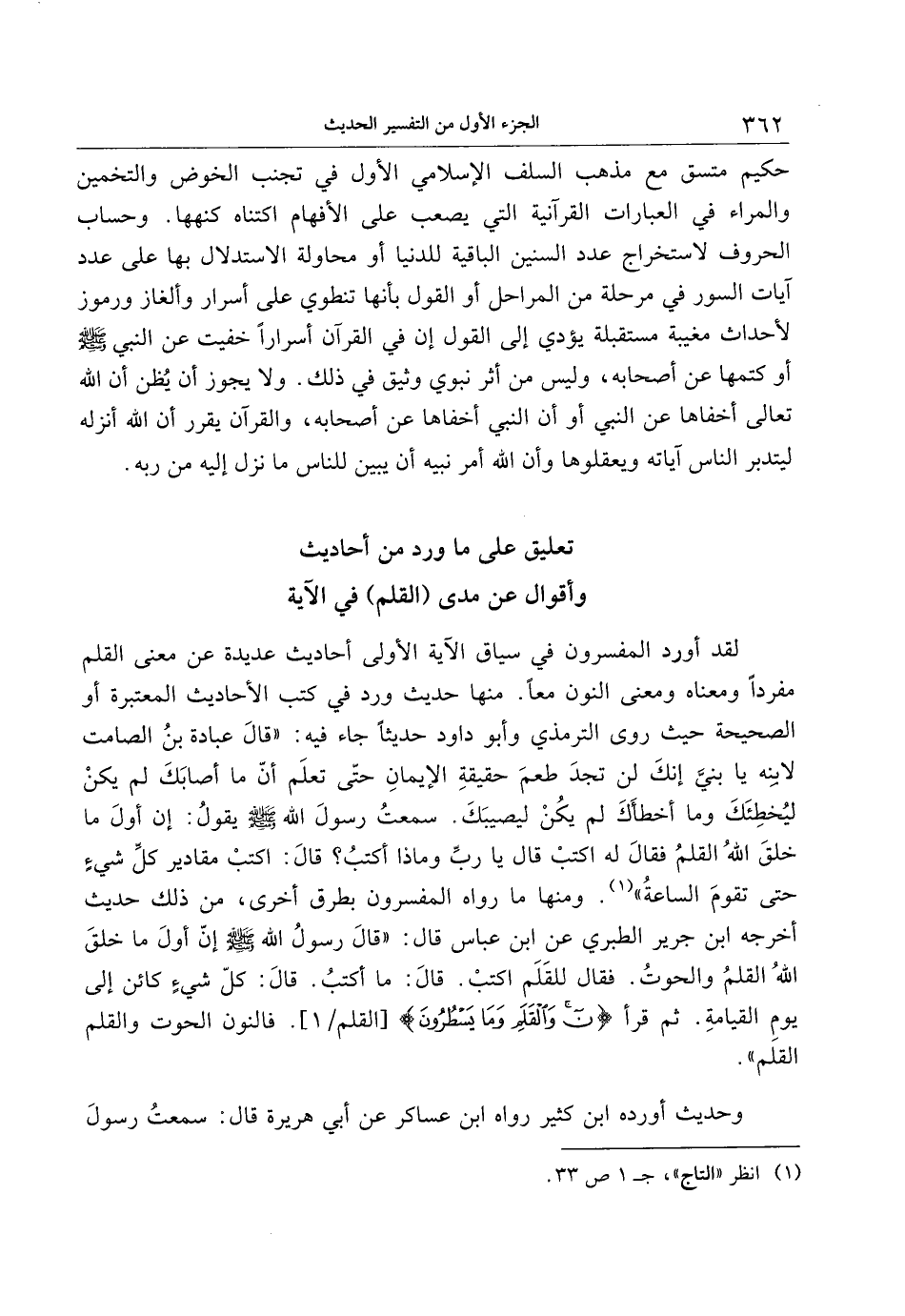لقد أورد المفسرون في سياق الآية الأولى أحاديث عديدة عن معنى القلم مفردا ومعناه ومعنى النون معا. منها حديث ورد في كتب الأحاديث المعتبرة أو الصحيحة حيث روى الترمذي وأبو داود حديثا جاء فيه: «قال عبادة بن الصامت لابنه يا بنيّ إنك لن تجد طعم حقيقة الإيمان حتّى تعلم أنّ ما أصابك لم يكن ليخطئك وما أخطأك لم يكن ليصيبك. سمعت رسول الله صلّى الله عليه وسلّم يقول: إن أول ما خلق الله القلم فقال له اكتب قال يا ربّ وماذا أكتب؟ قال: اكتب مقادير كلّ شيء حتى تقوم الساعة» «1» . ومنها ما رواه المفسرون بطرق أخرى، من ذلك حديث أخرجه ابن جرير الطبري عن ابن عباس قال: «قال رسول الله صلى الله عليه وسلّم إن أول ما خلق الله القلم والحوت. فقال للقلم اكتب. قال: ما أكتب. قال: كلّ شيء كائن إلى يوم القيامة. ثم قرأ ن وَالْقَلَمِ وَما يَسْطُرُونَ [القلم/ 1] . فالنون الحوت والقلم القلم» .
