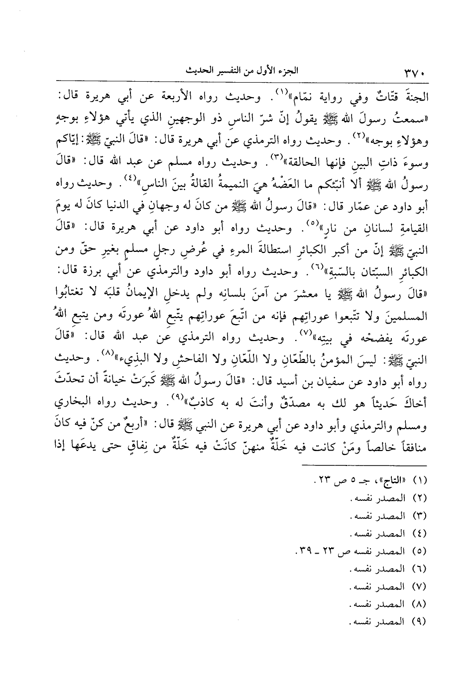 «قال رسول الله صلّى الله عليه وسلّم يا معشر من آمن بلسانه ولم يدخل الإيمان قلبه لا تغتابوا المسلمين ولا تتّبعوا عوراتهم فإنه من اتّبع عوراتهم يتّبع الله عورته ومن يتبع الله عورته يفضحه في بيته» «7» . وحديث رواه الترمذي عن عبد الله قال: «قال النبيّ صلّى الله عليه وسلم: ليس المؤمن بالطّعّان ولا اللّعّان ولا الفاحش ولا البذيء» «8» . وحديث رواه أبو داود عن سفيان بن أسيد قال: «قال رسول الله صلّى الله عليه وسلّم كبرت خيانة أن تحدّث أخاك حديثا هو لك به مصدّق وأنت له به كاذب» «9» . وحديث رواه البخاري ومسلم والترمذي وأبو داود عن أبي هريرة عن النبي صلّى الله عليه وسلّم قال: «أربع من كنّ فيه كان منافقا خالصا ومن كانت فيه خلّة منهنّ كانت فيه خلّة من نفاق حتى يدعها إذا