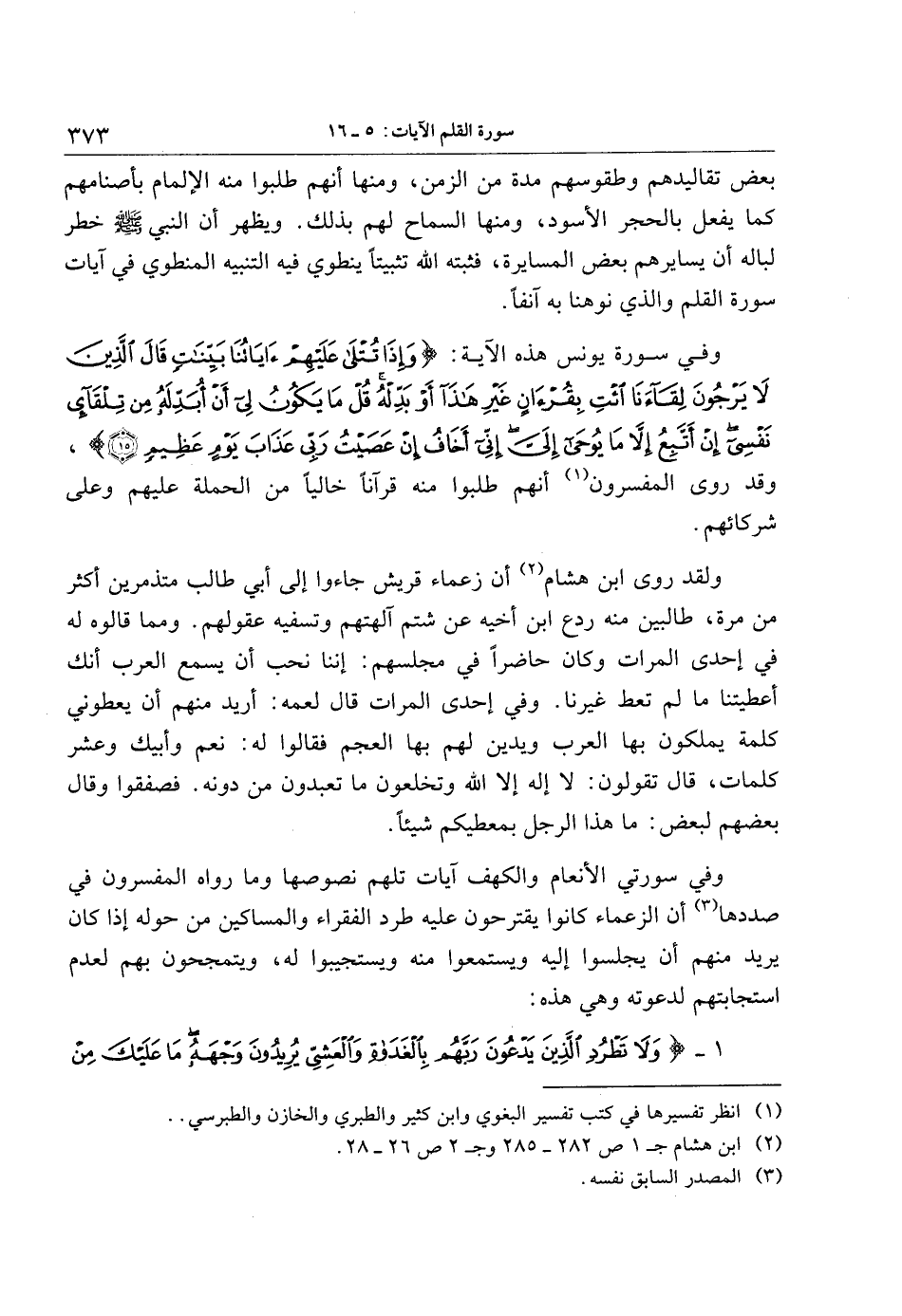 بعض تقاليدهم وطقوسهم مدة من الزمن، ومنها أنهم طلبوا منه الإلمام بأصنامهم كما يفعل بالحجر الأسود، ومنها السماح لهم بذلك. ويظهر أن النبي صلّى الله عليه وسلّم خطر لباله أن يسايرهم بعض المسايرة، فثبته الله تثبيتا ينطوي فيه التنبيه المنطوي في آيات سورة القلم والذي نوهنا به آنفا.
