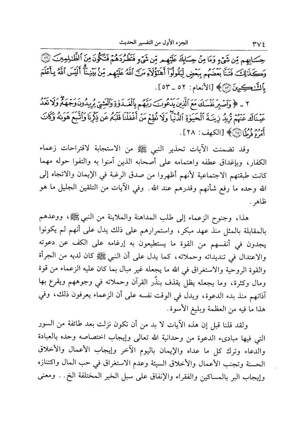 وقد تضمنت الآيات تحذير النبي صلى الله عليه وسلّم من الاستجابة لاقتراحات زعماء الكفار، وبإغداق عطفه واهتمامه على أصحابه الذين آمنوا به والتفوا حوله مهما كانت طبقتهم الاجتماعية لأنهم أظهروا من صدق الرغبة في الإيمان والاتجاه إلى الله وحده ما رفع شأنهم وقدرهم عند الله. وفي الآيات من التلقين الجليل ما هو ظاهر.