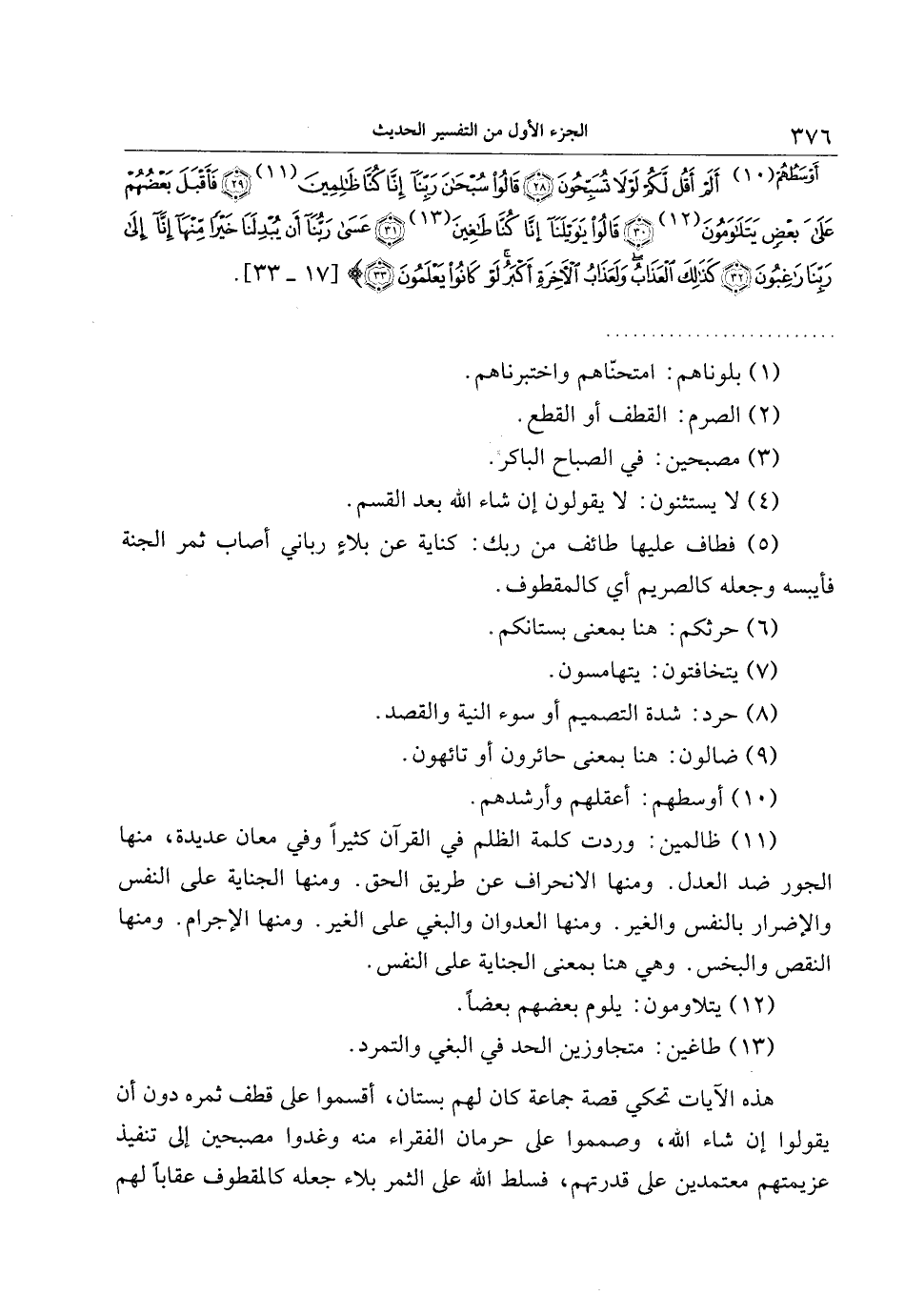هذه الآيات تحكي قصة جماعة كان لهم بستان، أقسموا على قطف ثمره دون أن يقولوا إن شاء الله، وصمموا على حرمان الفقراء منه وغدوا مصبحين إلى تنفيذ عزيمتهم معتمدين على قدرتهم، فسلط الله على الثمر بلاء جعله كالمقطوف عقابا لهم