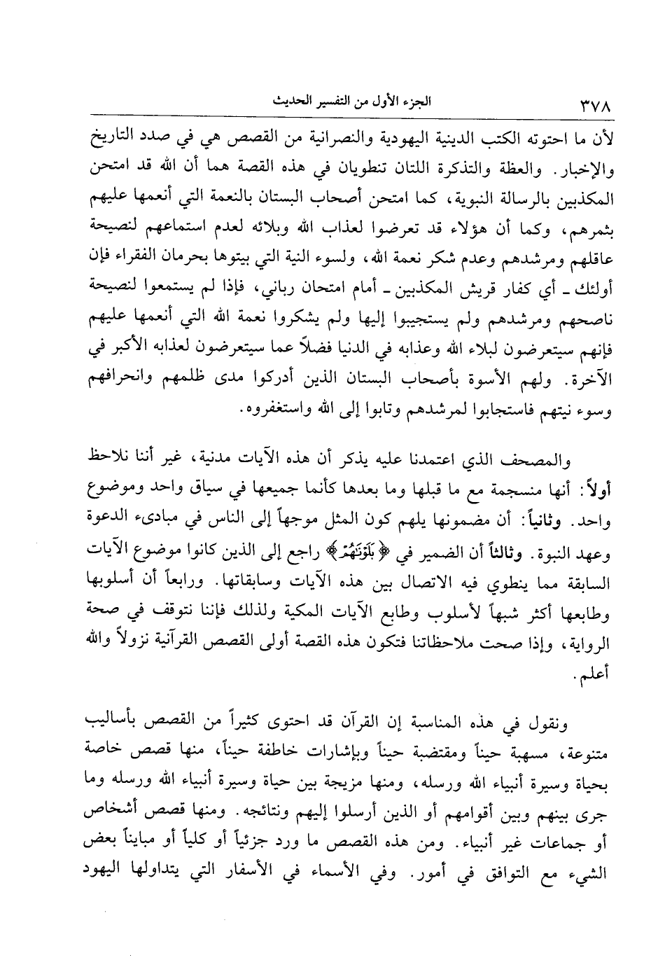 لأن ما احتوته الكتب الدينية اليهودية والنصرانية من القصص هي في صدد التاريخ والإخبار. والعظة والتذكرة اللتان تنطويان في هذه القصة هما أن الله قد امتحن المكذبين بالرسالة النبوية، كما امتحن أصحاب البستان بالنعمة التي أنعمها عليهم بثمرهم، وكما أن هؤلاء قد تعرضوا لعذاب الله وبلائه لعدم استماعهم لنصيحة عاقلهم ومرشدهم وعدم شكر نعمة الله، ولسوء النية التي بيتوها بحرمان الفقراء فإن أولئك- أي كفار قريش المكذبين- أمام امتحان رباني، فإذا لم يستمعوا لنصيحة ناصحهم ومرشدهم ولم يستجيبوا إليها ولم يشكروا نعمة الله التي أنعمها عليهم فإنهم سيتعرضون لبلاء الله وعذابه في الدنيا فضلا عما سيتعرضون لعذابه الأكبر في الآخرة. ولهم الأسوة بأصحاب البستان الذين أدركوا مدى ظلمهم وانحرافهم وسوء نيتهم فاستجابوا لمرشدهم وتابوا إلى الله واستغفروه.