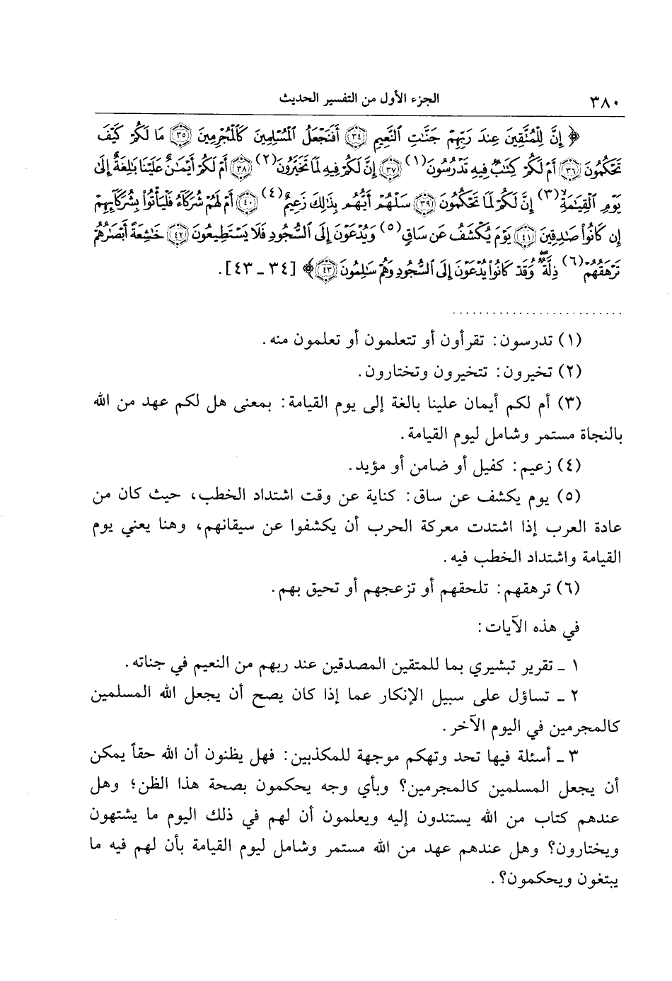 إِنَّ لِلْمُتَّقِينَ عِنْدَ رَبِّهِمْ جَنَّاتِ النَّعِيمِ (34) أَفَنَجْعَلُ الْمُسْلِمِينَ كَالْمُجْرِمِينَ (35) ما لَكُمْ كَيْفَ تَحْكُمُونَ (36) أَمْ لَكُمْ كِتابٌ فِيهِ تَدْرُسُونَ (37) إِنَّ لَكُمْ فِيهِ لَما تَخَيَّرُونَ (38)