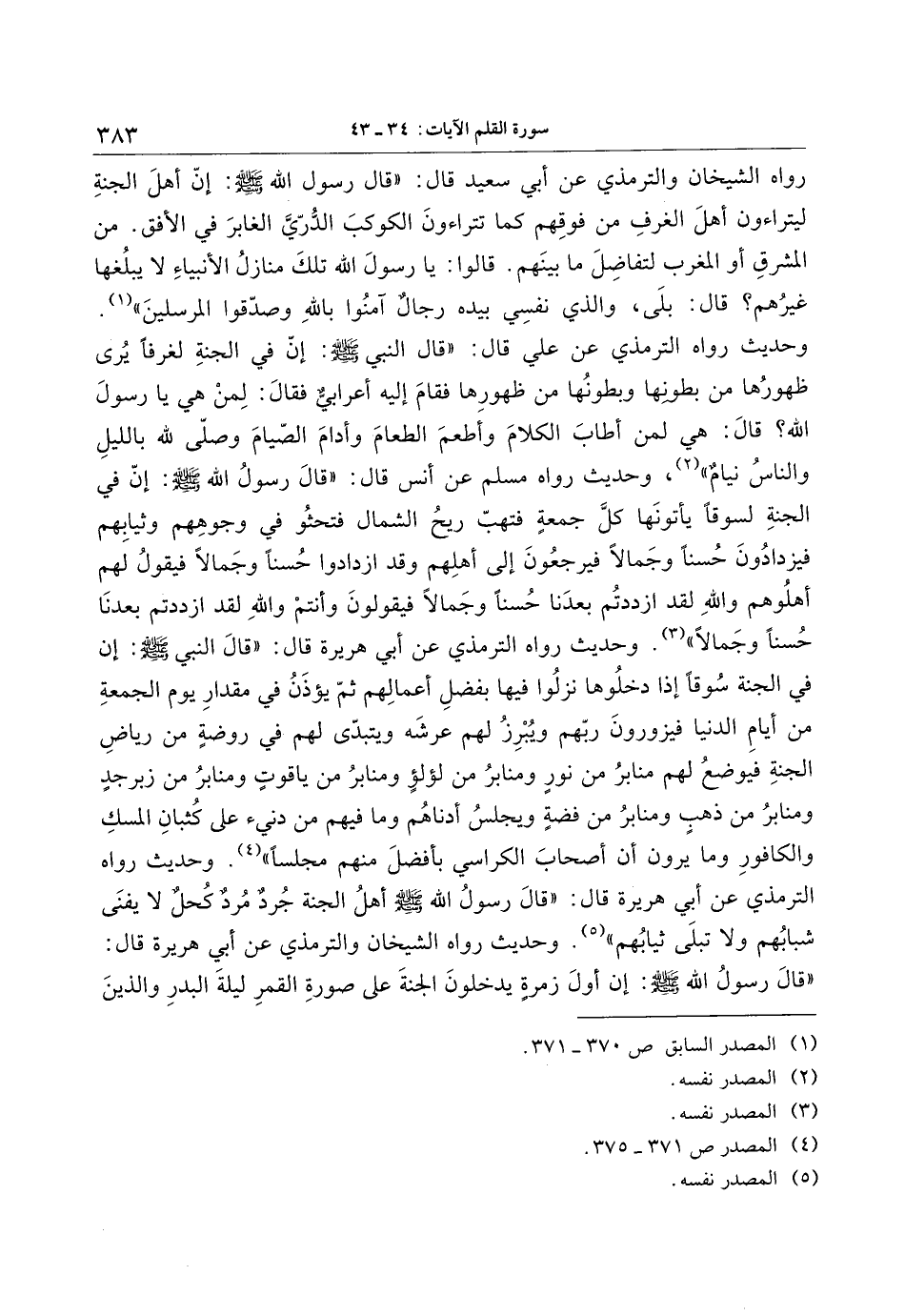 وحديث رواه الترمذي عن علي قال: «قال النبي صلّى الله عليه وسلّم: إنّ في الجنة لغرفا يرى ظهورها من بطونها وبطونها من ظهورها فقام إليه أعرابي فقال: لمن هي يا رسول الله؟ قال: هي لمن أطاب الكلام وأطعم الطعام وأدام الصّيام وصلّى لله بالليل والناس نيام» «2» ، وحديث رواه مسلم عن أنس قال: «قال رسول الله صلّى الله عليه وسلم: إنّ في الجنة لسوقا يأتونها كلّ جمعة فتهبّ ريح الشمال فتحثو في وجوههم وثيابهم فيزدادون حسنا وجمالا فيرجعون إلى أهلهم وقد ازدادوا حسنا وجمالا فيقول لهم أهلوهم والله لقد ازددتم بعدنا حسنا وجمالا فيقولون وأنتم والله لقد ازددتم بعدنا حسنا وجمالا» «3» . وحديث رواه الترمذي عن أبي هريرة قال: «قال النبي صلّى الله عليه وسلم: إن في الجنة سوقا إذا دخلوها نزلوا فيها بفضل أعمالهم ثمّ يؤذن في مقدار يوم الجمعة من أيام الدنيا فيزورون ربّهم ويبرز لهم عرشه ويتبدّى لهم في روضة من رياض الجنة فيوضع لهم منابر من نور ومنابر من لؤلؤ ومنابر من ياقوت ومنابر من زبرجد ومنابر من ذهب ومنابر من فضة ويجلس أدناهم وما فيهم من دنيء على كثبان المسك والكافور وما يرون أن أصحاب الكراسي بأفضل منهم مجلسا» «4» . وحديث رواه الترمذي عن أبي هريرة قال: «قال رسول الله صلّى الله عليه وسلّم أهل الجنة جرد مرد كحل لا يفنى شبابهم ولا تبلى ثيابهم» «5» . وحديث رواه الشيخان والترمذي عن أبي هريرة قال: