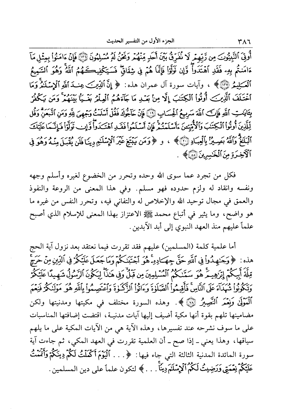 أما علمية كلمة (المسلمين) عليهم فقد تقررت فيما نعتقد بعد نزول آية الحج هذه: وَجاهِدُوا فِي اللَّهِ حَقَّ جِهادِهِ هُوَ اجْتَباكُمْ وَما جَعَلَ عَلَيْكُمْ فِي الدِّينِ مِنْ حَرَجٍ مِلَّةَ أَبِيكُمْ إِبْراهِيمَ هُوَ سَمَّاكُمُ الْمُسْلِمِينَ مِنْ قَبْلُ وَفِي هذا لِيَكُونَ الرَّسُولُ شَهِيداً عَلَيْكُمْ وَتَكُونُوا شُهَداءَ عَلَى النَّاسِ فَأَقِيمُوا الصَّلاةَ وَآتُوا الزَّكاةَ وَاعْتَصِمُوا بِاللَّهِ هُوَ مَوْلاكُمْ فَنِعْمَ الْمَوْلى وَنِعْمَ النَّصِيرُ (78) . وهذه السورة مختلف في مكيتها ومدنيتها ولكن مضامينها تلهم بقوة أنها مكية أضيف إليها آيات مدنية، اقتضت إضافتها المناسبات على ما سوف نشرحه عند تفسيرها، وهذه الآية هي من الآيات المكية على ما يلهم سياقها، وهذا يعني- إذا صح- أن العلمية تقررت في العهد المكي، ثم جاءت آية سورة المائدة المدنية الثالثة التي جاء فيها: ... الْيَوْمَ أَكْمَلْتُ لَكُمْ دِينَكُمْ وَأَتْمَمْتُ عَلَيْكُمْ نِعْمَتِي وَرَضِيتُ لَكُمُ الْإِسْلامَ دِيناً ... لتكون علما على دين المسلمين.