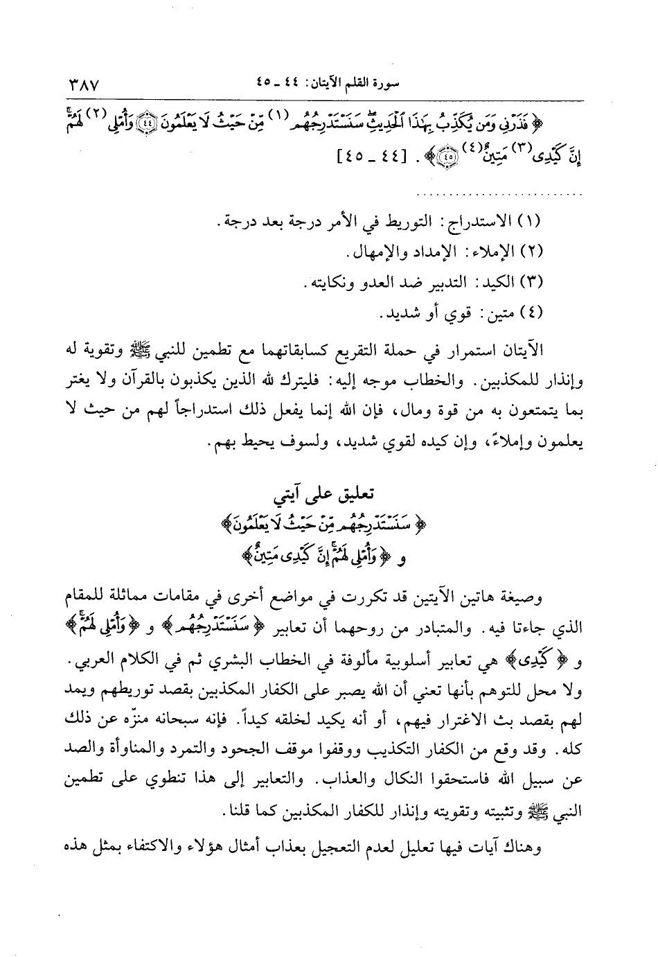 وصيغة هاتين الآيتين قد تكررت في مواضع أخرى في مقامات مماثلة للمقام الذي جاءتا فيه. والمتبادر من روحهما أن تعابير سَنَسْتَدْرِجُهُمْ ووَ أُمْلِي لَهُمْ وكَيْدِي هي تعابير أسلوبية مألوفة في الخطاب البشري ثم في الكلام العربي.