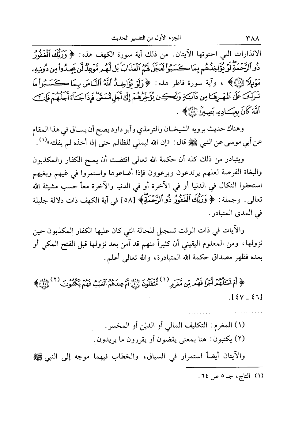 الانذارات التي احتوتها الآيتان. من ذلك آية سورة الكهف هذه: وَرَبُّكَ الْغَفُورُ ذُو الرَّحْمَةِ لَوْ يُؤاخِذُهُمْ بِما كَسَبُوا لَعَجَّلَ لَهُمُ الْعَذابَ بَلْ لَهُمْ مَوْعِدٌ لَنْ يَجِدُوا مِنْ دُونِهِ مَوْئِلًا (58) ، وآية سورة فاطر هذه: وَلَوْ يُؤاخِذُ اللَّهُ النَّاسَ بِما كَسَبُوا ما تَرَكَ عَلى ظَهْرِها مِنْ دَابَّةٍ وَلكِنْ يُؤَخِّرُهُمْ إِلى أَجَلٍ مُسَمًّى فَإِذا جاءَ أَجَلُهُمْ فَإِنَّ اللَّهَ كانَ بِعِبادِهِ بَصِيراً (45) .