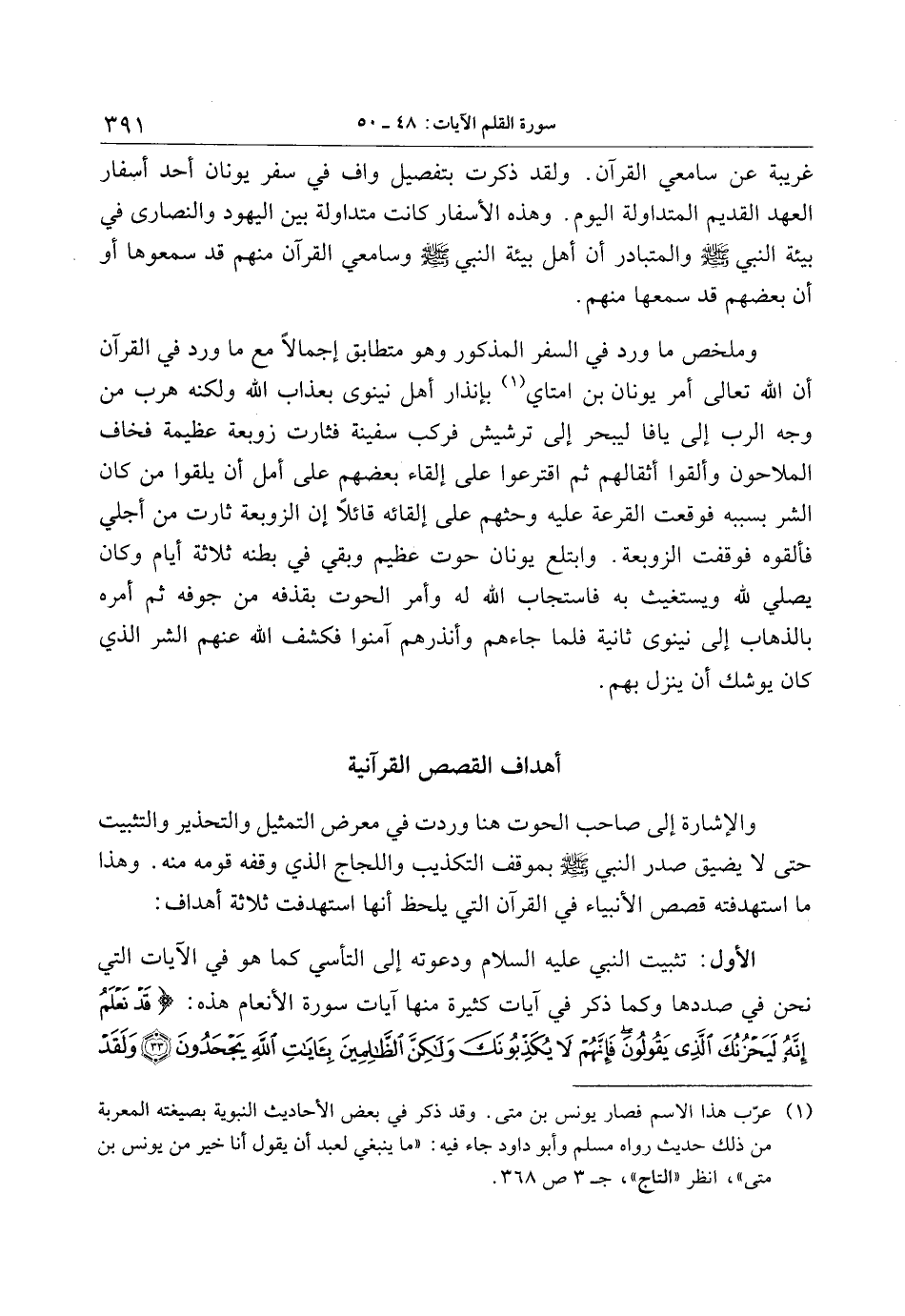 والإشارة إلى صاحب الحوت هنا وردت في معرض التمثيل والتحذير والتثبيت حتى لا يضيق صدر النبي صلّى الله عليه وسلّم بموقف التكذيب واللجاج الذي وقفه قومه منه. وهذا ما استهدفته قصص الأنبياء في القرآن التي يلحظ أنها استهدفت ثلاثة أهداف: