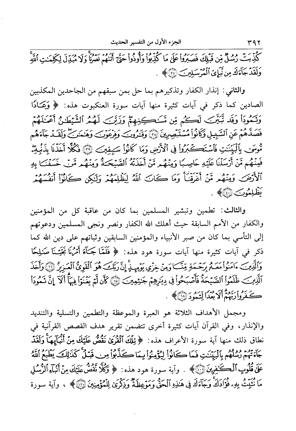 ومجمل الأهداف الثلاثة هو العبرة والموعظة والتطمين والتسلية والتنديد والإنذار، وفي القرآن آيات كثيرة أخرى تتضمن تقرير هدف القصص القرآنية في نطاق ذلك منها آية سورة الأعراف هذه: تِلْكَ الْقُرى نَقُصُّ عَلَيْكَ مِنْ أَنْبائِها وَلَقَدْ جاءَتْهُمْ رُسُلُهُمْ بِالْبَيِّناتِ فَما كانُوا لِيُؤْمِنُوا بِما كَذَّبُوا مِنْ قَبْلُ كَذلِكَ يَطْبَعُ اللَّهُ عَلى قُلُوبِ الْكافِرِينَ (101) . وآية سورة هود هذه: وَكُلًّا نَقُصُّ عَلَيْكَ مِنْ أَنْباءِ الرُّسُلِ ما نُثَبِّتُ بِهِ فُؤادَكَ وَجاءَكَ فِي هذِهِ الْحَقُّ وَمَوْعِظَةٌ وَذِكْرى لِلْمُؤْمِنِينَ (120) ، وآية سورة