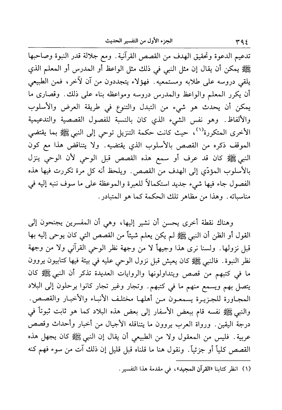 تدعيم الدعوة وتحقيق الهدف من القصص القرآنية. ومع جلالة قدر النبوة وصاحبها صلى الله عليه وسلّم يمكن أن يقال إن مثل النبي في ذلك مثل الواعظ أو المدرس أو المعلم الذي يلقي دروسه على طلابه ومستمعيه. فهؤلاء يتجددون من آن لآخر، فمن الطبيعي أن يكرر المعلم والواعظ والمدرس دروسه ومواعظه بناء على ذلك. وقصارى ما يمكن أن يحدث هو شيء من التبدل والتنوع في طريقة العرض والأسلوب والألفاظ. وهو نفس الشيء الذي كان بالنسبة للفصول القصصية والتدعيمية الأخرى المتكررة «1» ، حيث كانت حكمة التنزيل توحي إلى النبي صلّى الله عليه وسلّم بما يقتضي الموقف ذكره من القصص بالأسلوب الذي يقتضيه. ولا يتناقض هذا مع كون النبي صلى الله عليه وسلّم كان قد عرف أو سمع هذه القصص قبل الوحي لأن الوحي ينزل بالأسلوب المؤدّي إلى الهدف من القصص. ويلحظ أنه كل مرة تكررت فيها هذه الفصول جاء فيها شيء جديد استكمالا للعبرة والموعظة على ما سوف ننبه إليه في مناسباته. وهذا من مظاهر تلك الحكمة كما هو المتبادر.