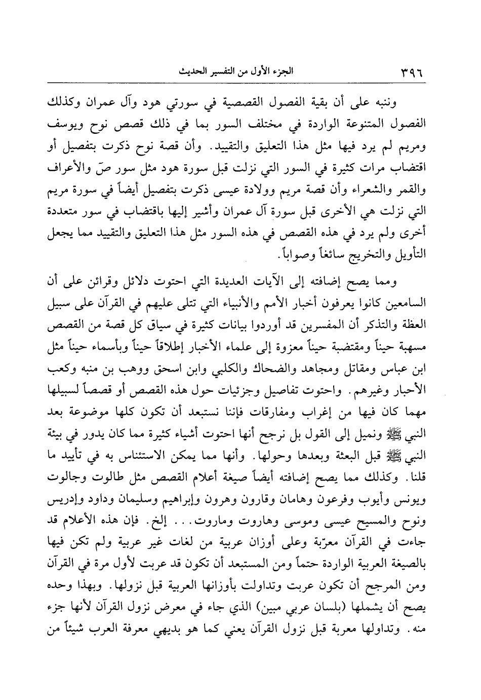 وننبه على أن بقية الفصول القصصية في سورتي هود وآل عمران وكذلك الفصول المتنوعة الواردة في مختلف السور بما في ذلك قصص نوح ويوسف ومريم لم يرد فيها مثل هذا التعليق والتقييد. وأن قصة نوح ذكرت بتفصيل أو اقتضاب مرات كثيرة في السور التي نزلت قبل سورة هود مثل سور ص والأعراف والقمر والشعراء وأن قصة مريم وولادة عيسى ذكرت بتفصيل أيضا في سورة مريم التي نزلت هي الأخرى قبل سورة آل عمران وأشير إليها باقتضاب في سور متعددة أخرى ولم يرد في هذه القصص في هذه السور مثل هذا التعليق والتقييد مما يجعل التأويل والتخريج سائغا وصوابا.