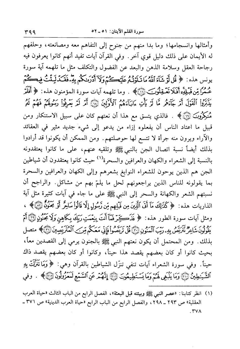 وأمثالها وانسجامها وما بدا منهم من جنوح إلى التفاهم معه ومصانعته، وحلفهم له الأيمان على ذلك دليل قوي آخر. وفي القرآن آيات تفيد أنهم كانوا يعرفون فيه رجاحة العقل وسلامة الذهن والبعد عن الفضول والتكلف مثل ما تلهمه آية سورة يونس هذه: قُلْ لَوْ شاءَ اللَّهُ ما تَلَوْتُهُ عَلَيْكُمْ وَلا أَدْراكُمْ بِهِ فَقَدْ لَبِثْتُ فِيكُمْ عُمُراً مِنْ قَبْلِهِ أَفَلا تَعْقِلُونَ (16) . وما تلهمه آيات سورة المؤمنون هذه: أَفَلَمْ يَدَّبَّرُوا الْقَوْلَ أَمْ جاءَهُمْ ما لَمْ يَأْتِ آباءَهُمُ الْأَوَّلِينَ (68) أَمْ لَمْ يَعْرِفُوا رَسُولَهُمْ فَهُمْ لَهُ مُنْكِرُونَ (69) . فالذي يتسق مع هذا أن نعتهم كان على سبيل الاستنكار ومن قبيل ما اعتاد الناس أن يفعلوه إزاء من يدعو إلى شيء جديد مثير في العقائد والآراء ويرون منه جرأة لا تتسع لها حوصلتهم. ومن الممكن أن يكونوا قد أرادوا بذلك أيضا نسبة اتصال الجن بالنبي صلّى الله عليه وسلّم وتلقيه عنهم، على ما كانوا يعتقدونه بالنسبة إلى الشعراء والكهان والعرافين والسحرة «1» حيث كانوا يعتقدون أن شياطين الجن هم الذين يوحون للشعراء النوابغ بشعرهم وإلى الكهان والعرافين والسحرة بما يقولونه للناس الذين يراجعونهم لحل ما يلمّ بهم من مشاكل. والراجح أن نسبتهم الشعر والكهانة والسحر إلى النبي صلّى الله عليه وسلّم على ما جاء في آيات كثيرة مثل آية الذاريات هذه: كَذلِكَ ما أَتَى الَّذِينَ مِنْ قَبْلِهِمْ مِنْ رَسُولٍ إِلَّا قالُوا ساحِرٌ أَوْ مَجْنُونٌ (52) ، ومثل آيات سورة الطور هذه: فَذَكِّرْ فَما أَنْتَ بِنِعْمَةِ رَبِّكَ بِكاهِنٍ وَلا مَجْنُونٍ (29) أَمْ يَقُولُونَ شاعِرٌ نَتَرَبَّصُ بِهِ رَيْبَ الْمَنُونِ (30) قُلْ تَرَبَّصُوا فَإِنِّي مَعَكُمْ مِنَ الْمُتَرَبِّصِينَ (31) متصل بذلك. ومن المحتمل أن يكون نعتهم النبي صلّى الله عليه وسلّم بالجنون يرمي إلى القصدين معا، بحيث كانوا أو كان بعضهم يقصد هذا حينا، وكانوا أو كان بعضهم يقصد ذاك حينا. وفي سورة الشعراء آيات تنفي تنزّل الشياطين بالقرآن وهي: وَما تَنَزَّلَتْ بِهِ الشَّياطِينُ (210) وَما يَنْبَغِي لَهُمْ وَما يَسْتَطِيعُونَ (211) إِنَّهُمْ عَنِ السَّمْعِ لَمَعْزُولُونَ (212) . وفي