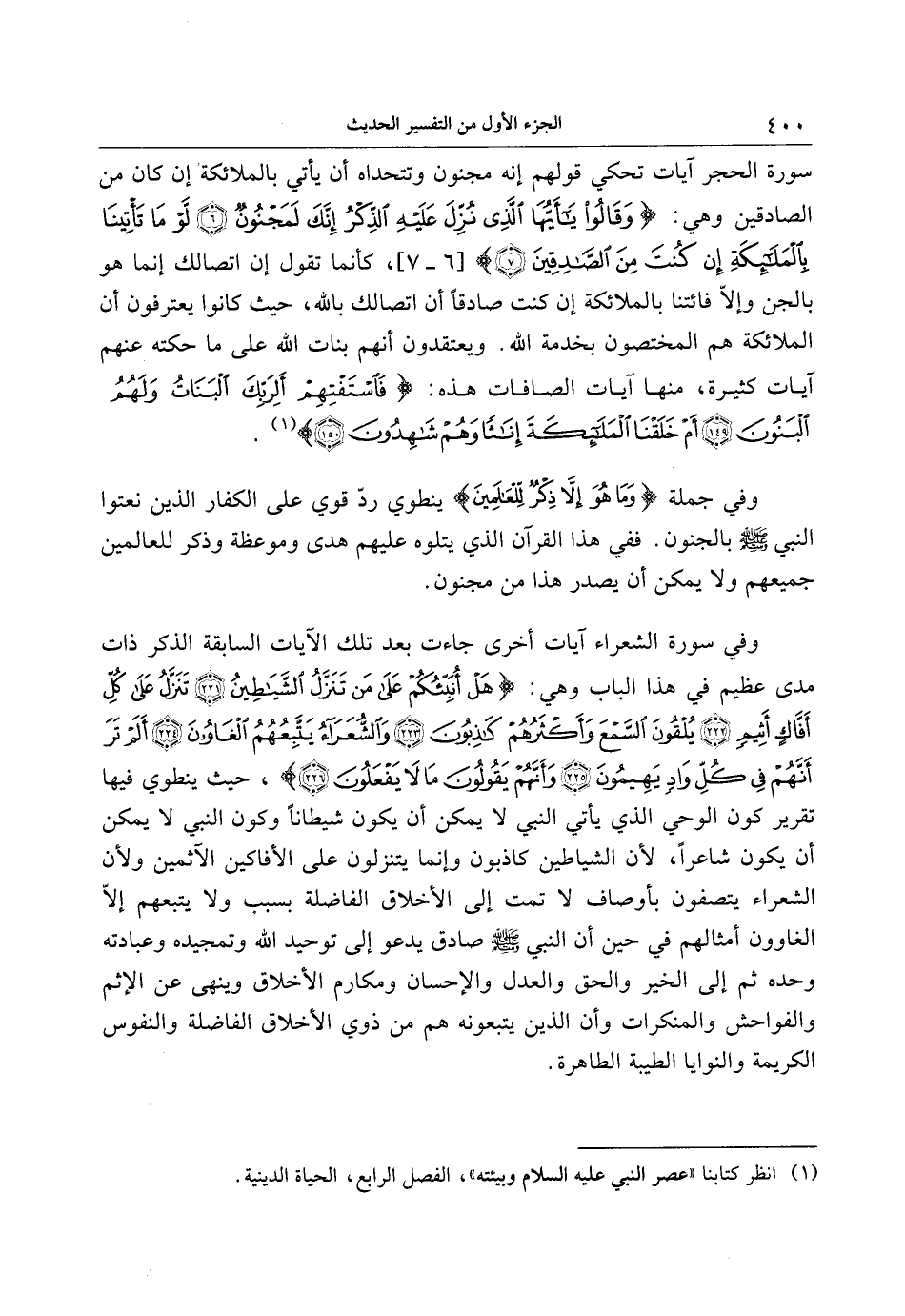 سورة الحجر آيات تحكي قولهم إنه مجنون وتتحداه أن يأتي بالملائكة إن كان من الصادقين وهي: وَقالُوا يا أَيُّهَا الَّذِي نُزِّلَ عَلَيْهِ الذِّكْرُ إِنَّكَ لَمَجْنُونٌ (6) لَوْ ما تَأْتِينا بِالْمَلائِكَةِ إِنْ كُنْتَ مِنَ الصَّادِقِينَ (7) [6- 7] ، كأنما تقول إن اتصالك إنما هو بالجن وإلّا فائتنا بالملائكة إن كنت صادقا أن اتصالك بالله، حيث كانوا يعترفون أن الملائكة هم المختصون بخدمة الله. ويعتقدون أنهم بنات الله على ما حكته عنهم آيات كثيرة، منها آيات الصافات هذه: فَاسْتَفْتِهِمْ أَلِرَبِّكَ الْبَناتُ وَلَهُمُ الْبَنُونَ (149) أَمْ خَلَقْنَا الْمَلائِكَةَ إِناثاً وَهُمْ شاهِدُونَ (150) «1» .
