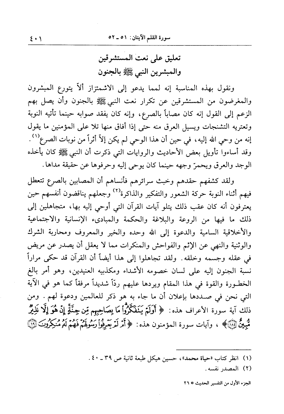 ونقول بهذه المناسبة إنه لمما يدعو إلى الاشمئزاز ألّا يتورع المبشرون والمغرضون من المستشرقين عن تكرار نعت النبي صلّى الله عليه وسلّم بالجنون وأن يصل بهم الزعم إلى القول إنه كان مصابا بالصرع، وإنه كان يفقد صوابه حينما تأتيه النوبة وتعتريه التشنجات ويسيل العرق منه حتى إذا أفاق منها تلا على المؤمنين ما يقول إنه من وحي الله إليه، في حين أن هذا الوحي لم يكن إلّا أثرا من نوبات الصرع «1» .