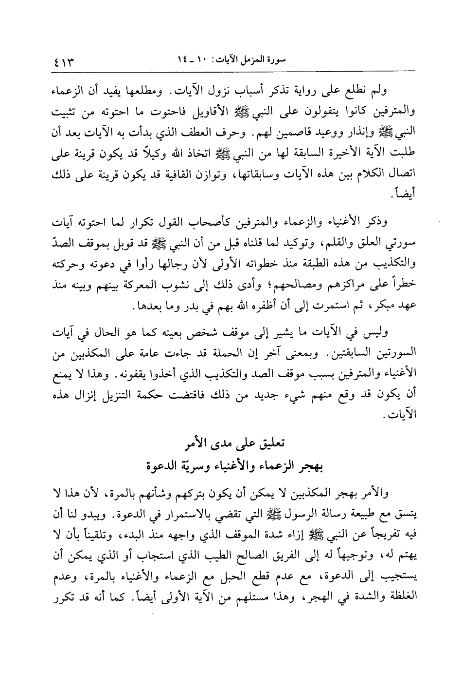 والأمر بهجر المكذبين لا يمكن أن يكون بتركهم وشأنهم بالمرة، لأن هذا لا يتسق مع طبيعة رسالة الرسول صلّى الله عليه وسلّم التي تقضي بالاستمرار في الدعوة. ويبدو لنا أن فيه تفريجا عن النبي صلّى الله عليه وسلّم إزاء شدة الموقف الذي واجهه منذ البدء، وتلقينا بأن لا يهتم له، وتوجيها له إلى الفريق الصالح الطيب الذي استجاب أو الذي يمكن أن يستجيب إلى الدعوة، مع عدم قطع الحبل مع الزعماء والأغنياء بالمرة، وعدم الغلظة والشدة في الهجر، وهذا مستلهم من الآية الأولى أيضا. كما أنه قد تكرر