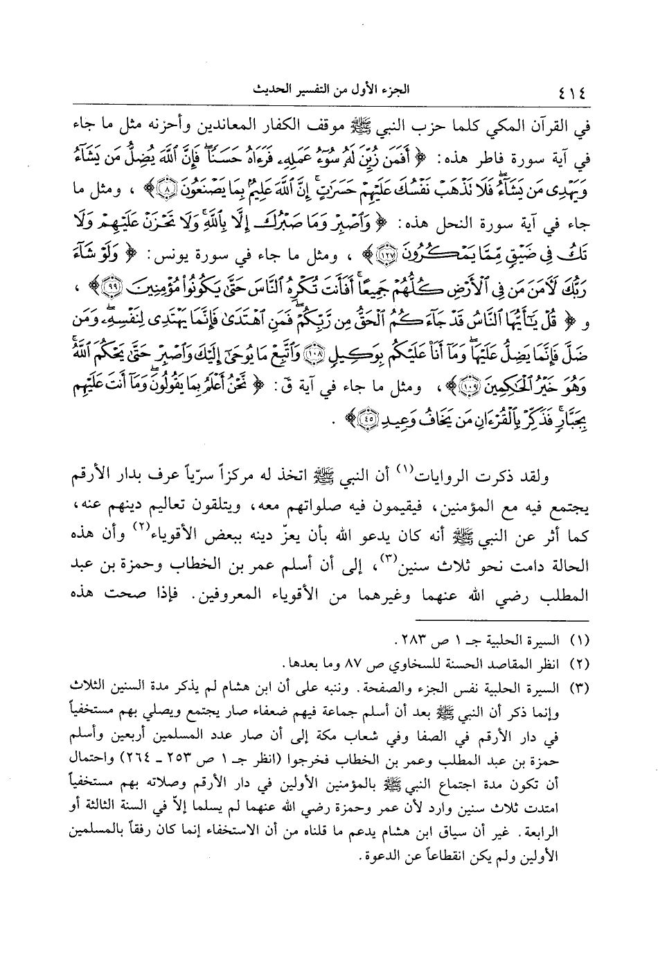 (3) السيرة الحلبية نفس الجزء والصفحة. وننبه على أن ابن هشام لم يذكر مدة السنين الثلاث وإنما ذكر أن النبي صلّى الله عليه وسلّم بعد أن أسلم جماعة فيهم ضعفاء صار يجتمع ويصلي بهم مستخفيا في دار الأرقم في الصفا وفي شعاب مكة إلى أن صار عدد المسلمين أربعين وأسلم حمزة بن عبد المطلب وعمر بن الخطاب فخرجوا (انظر ج 1 ص 253- 264) واحتمال أن تكون مدة اجتماع النبي صلّى الله عليه وسلّم بالمؤمنين الأولين في دار الأرقم وصلاته بهم مستخفيا امتدت ثلاث سنين وارد لأن عمر وحمزة رضي الله عنهما لم يسلما إلّا في السنة الثالثة أو الرابعة. غير أن سياق ابن هشام يدعم ما قلناه من أن الاستخفاء إنما كان رفقا بالمسلمين الأولين ولم يكن انقطاعا عن الدعوة.