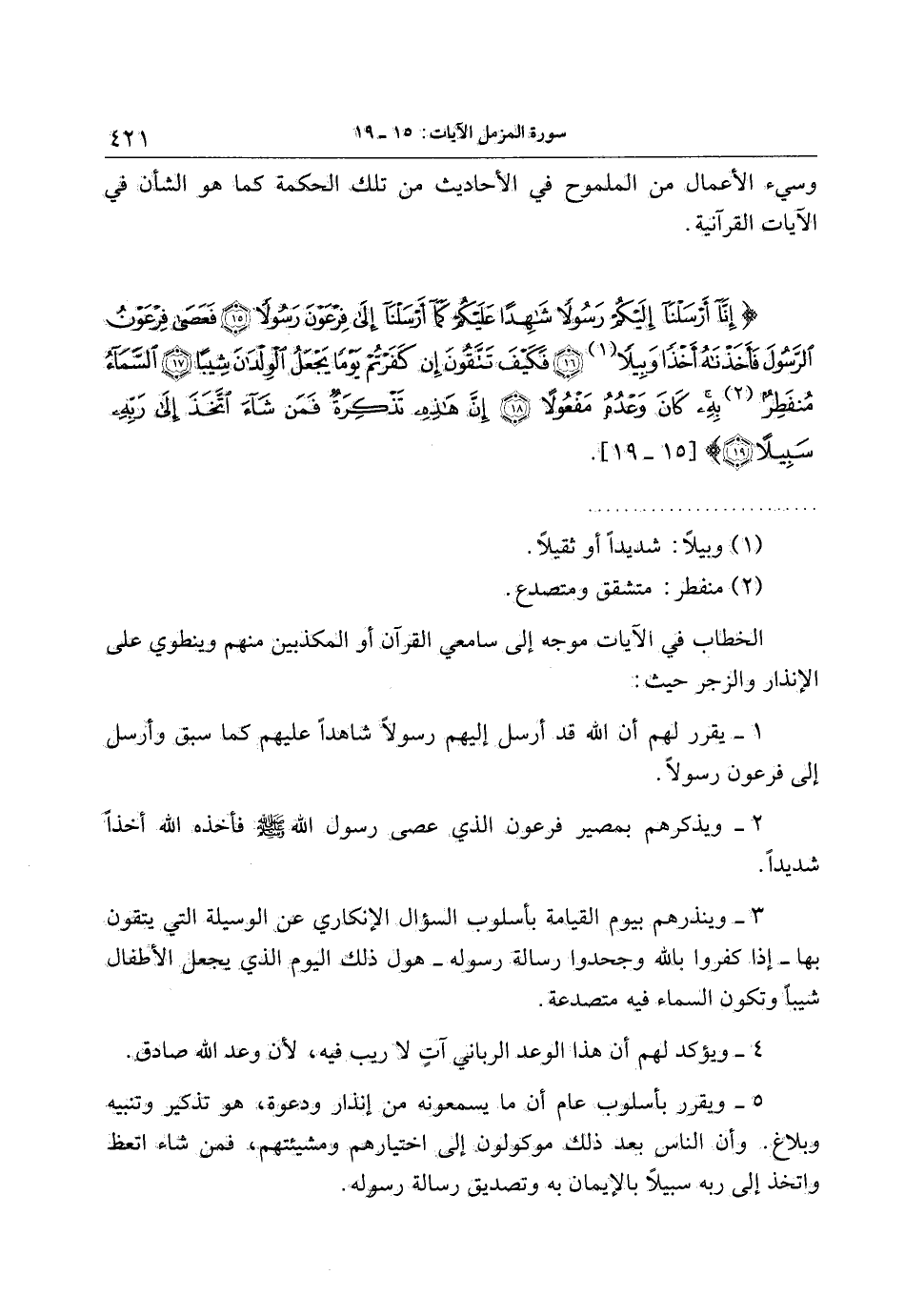 إِنَّا أَرْسَلْنا إِلَيْكُمْ رَسُولاً شاهِداً عَلَيْكُمْ كَما أَرْسَلْنا إِلى فِرْعَوْنَ رَسُولاً (15) فَعَصى فِرْعَوْنُ الرَّسُولَ فَأَخَذْناهُ أَخْذاً وَبِيلاً (16) فَكَيْفَ تَتَّقُونَ إِنْ كَفَرْتُمْ يَوْماً يَجْعَلُ الْوِلْدانَ شِيباً (17) السَّماءُ مُنْفَطِرٌ بِهِ كانَ وَعْدُهُ مَفْعُولاً (18) إِنَّ هذِهِ تَذْكِرَةٌ فَمَنْ شاءَ اتَّخَذَ إِلى رَبِّهِ سَبِيلاً (19)