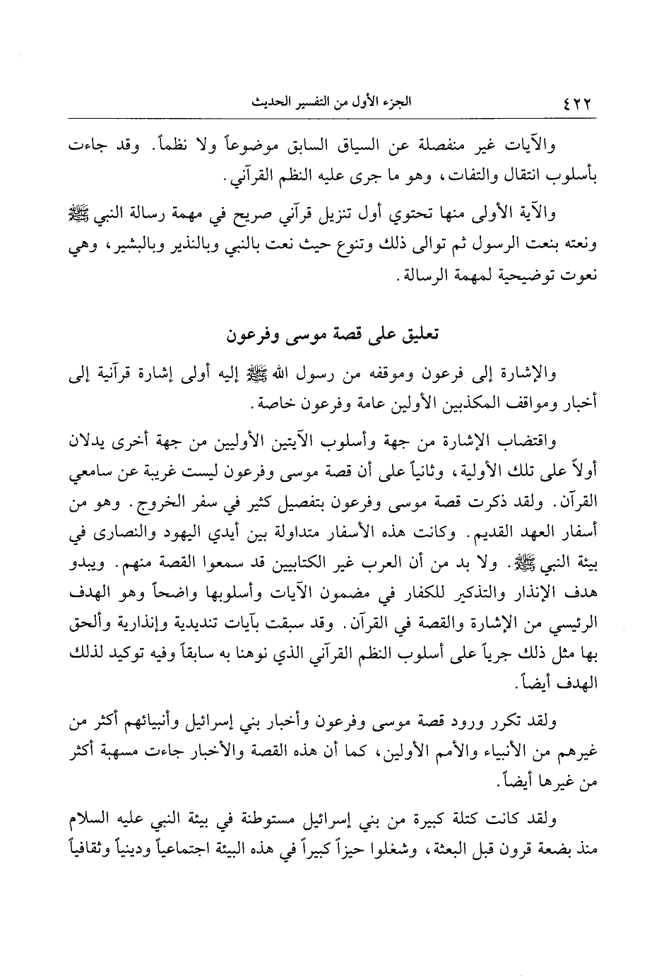 واقتضاب الإشارة من جهة وأسلوب الآيتين الأوليين من جهة أخرى يدلان أولا على تلك الأولية، وثانيا على أن قصة موسى وفرعون ليست غريبة عن سامعي القرآن. ولقد ذكرت قصة موسى وفرعون بتفصيل كثير في سفر الخروج. وهو من أسفار العهد القديم. وكانت هذه الأسفار متداولة بين أيدي اليهود والنصارى في بيئة النبي. صلّى الله عليه وسلم. ولا بد من أن العرب غير الكتابيين قد سمعوا القصة منهم. ويبدو هدف الإنذار والتذكير للكفار في مضمون الآيات وأسلوبها واضحا وهو الهدف الرئيسي من الإشارة والقصة في القرآن. وقد سبقت بآيات تنديدية وإنذارية وألحق بها مثل ذلك جريا على أسلوب النظم القرآني الذي نوهنا به سابقا وفيه توكيد لذلك الهدف أيضا.