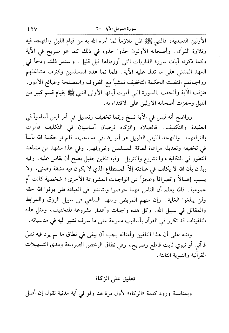 الأولين التعبدية، فالنبي صلّى الله عليه وسلّم ظل ملازما لما أمره الله به من قيام الليل والتهجد فيه وتلاوة القرآن. وأصحابه الأولون حذوا حذوه في ذلك كما هو صريح في الآية وكما ذكرته آيات سورة الذاريات التي أوردناها قبل قليل. واستمر ذلك ردحا في العهد المدني على ما تدل عليه الآية. فلما نما عدد المسلمين وكثرت مشاغلهم وواجباتهم اقتضت الحكمة التخفيف تمشيا مع الظروف والمصلحة وطبائع الأمور.