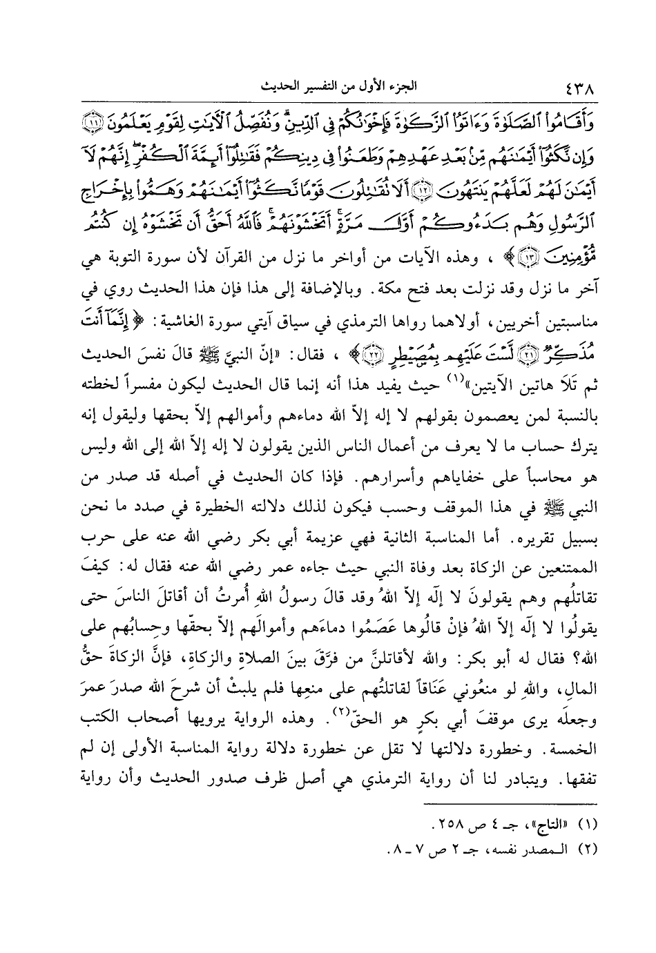 وَأَقامُوا الصَّلاةَ وَآتَوُا الزَّكاةَ فَإِخْوانُكُمْ فِي الدِّينِ وَنُفَصِّلُ الْآياتِ لِقَوْمٍ يَعْلَمُونَ (11) وَإِنْ نَكَثُوا أَيْمانَهُمْ مِنْ بَعْدِ عَهْدِهِمْ وَطَعَنُوا فِي دِينِكُمْ فَقاتِلُوا أَئِمَّةَ الْكُفْرِ إِنَّهُمْ لا أَيْمانَ لَهُمْ لَعَلَّهُمْ يَنْتَهُونَ (12) أَلا تُقاتِلُونَ قَوْماً نَكَثُوا أَيْمانَهُمْ وَهَمُّوا بِإِخْراجِ الرَّسُولِ وَهُمْ بَدَؤُكُمْ أَوَّلَ مَرَّةٍ أَتَخْشَوْنَهُمْ فَاللَّهُ أَحَقُّ أَنْ تَخْشَوْهُ إِنْ كُنْتُمْ مُؤْمِنِينَ (13) ، وهذه الآيات من أواخر ما نزل من القرآن لأن سورة التوبة هي آخر ما نزل وقد نزلت بعد فتح مكة. وبالإضافة إلى هذا فإن هذا الحديث روي في مناسبتين أخريين، أولاهما رواها الترمذي في سياق آيتي سورة الغاشية: إِنَّما أَنْتَ مُذَكِّرٌ (21) لَسْتَ عَلَيْهِمْ بِمُصَيْطِرٍ (22) ، فقال: «إنّ النبيّ صلّى الله عليه وسلّم قال نفس الحديث ثم تلا هاتين الآيتين» «1» حيث يفيد هذا أنه إنما قال الحديث ليكون مفسرا لخطته بالنسبة لمن يعصمون بقولهم لا إله إلّا الله دماءهم وأموالهم إلّا بحقها وليقول إنه يترك حساب ما لا يعرف من أعمال الناس الذين يقولون لا إله إلّا الله إلى الله وليس هو محاسبا على خفاياهم وأسرارهم. فإذا كان الحديث في أصله قد صدر من النبي صلّى الله عليه وسلّم في هذا الموقف وحسب فيكون لذلك دلالته الخطيرة في صدد ما نحن بسبيل تقريره. أما المناسبة الثانية فهي عزيمة أبي بكر رضي الله عنه على حرب الممتنعين عن الزكاة بعد وفاة النبي حيث جاءه عمر رضي الله عنه فقال له: كيف تقاتلهم وهم يقولون لا إله إلّا الله وقد قال رسول الله أمرت أن أقاتل الناس حتى يقولوا لا إله إلّا الله فإن قالوها عصموا دماءهم وأموالهم إلّا بحقّها وحسابهم على الله؟ فقال له أبو بكر: والله لأقاتلنّ من فرّق بين الصلاة والزكاة، فإنّ الزكاة حقّ المال، والله لو منعوني عناقا لقاتلتهم على منعها فلم يلبث أن شرح الله صدر عمر وجعله يرى موقف أبي بكر هو الحقّ «2» . وهذه الرواية يرويها أصحاب الكتب الخمسة. وخطورة دلالتها لا تقل عن خطورة دلالة رواية المناسبة الأولى إن لم تفقها. ويتبادر لنا أن رواية الترمذي هي أصل ظرف صدور الحديث وأن رواية
