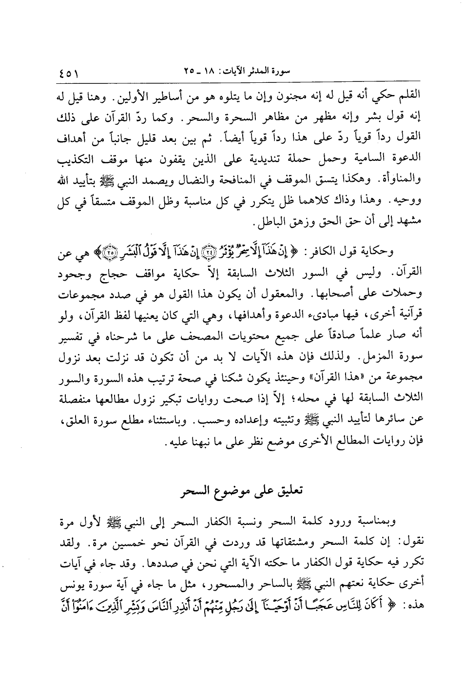 وحكاية قول الكافر: إِنْ هذا إِلَّا سِحْرٌ يُؤْثَرُ (24) إِنْ هذا إِلَّا قَوْلُ الْبَشَرِ (25) هي عن القرآن. وليس في السور الثلاث السابقة إلّا حكاية مواقف حجاج وجحود وحملات على أصحابها. والمعقول أن يكون هذا القول هو في صدد مجموعات قرآنية أخرى، فيها مبادئ الدعوة وأهدافها، وهي التي كان يعنيها لفظ القرآن، ولو أنه صار علما صادقا على جميع محتويات المصحف على ما شرحناه في تفسير سورة المزمل. ولذلك فإن هذه الآيات لا بد من أن تكون قد نزلت بعد نزول مجموعة من «هذا القرآن» وحينئذ يكون شكنا في صحة ترتيب هذه السورة والسور الثلاث السابقة لها في محله إلّا إذا صحت روايات تبكير نزول مطالعها منفصلة عن سائرها لتأييد النبي صلّى الله عليه وسلّم وتثبيته وإعداده وحسب. وباستثناء مطلع سورة العلق، فإن روايات المطالع الأخرى موضع نظر على ما نبهنا عليه.