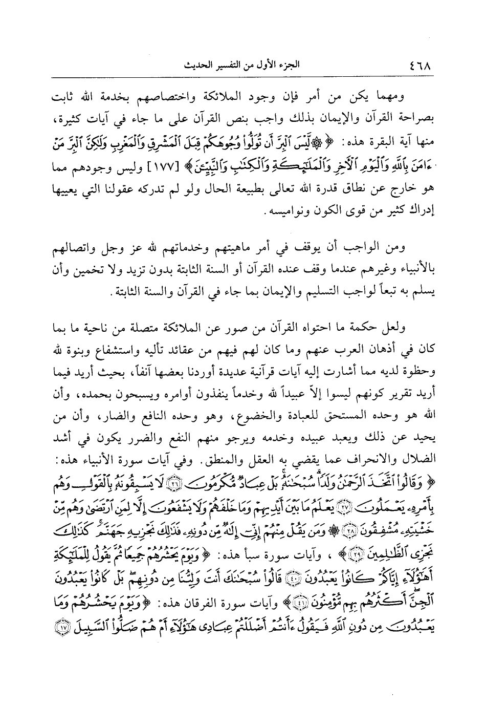 ومهما يكن من أمر فإن وجود الملائكة واختصاصهم بخدمة الله ثابت بصراحة القرآن والإيمان بذلك واجب بنص القرآن على ما جاء في آيات كثيرة، منها آية البقرة هذه: لَيْسَ الْبِرَّ أَنْ تُوَلُّوا وُجُوهَكُمْ قِبَلَ الْمَشْرِقِ وَالْمَغْرِبِ وَلكِنَّ الْبِرَّ مَنْ آمَنَ بِاللَّهِ وَالْيَوْمِ الْآخِرِ وَالْمَلائِكَةِ وَالْكِتابِ وَالنَّبِيِّينَ [177] وليس وجودهم مما هو خارج عن نطاق قدرة الله تعالى بطبيعة الحال ولو لم تدركه عقولنا التي يعييها إدراك كثير من قوى الكون ونواميسه.