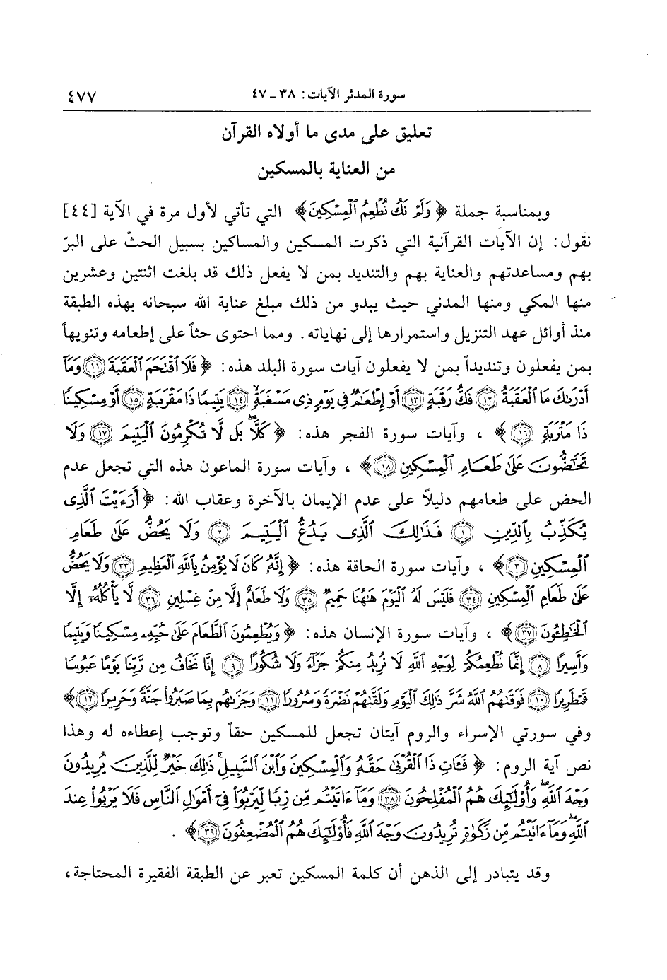 وبمناسبة جملة وَلَمْ نَكُ نُطْعِمُ الْمِسْكِينَ التي تأتي لأول مرة في الآية [44] نقول: إن الآيات القرآنية التي ذكرت المسكين والمساكين بسبيل الحثّ على البرّ بهم ومساعدتهم والعناية بهم والتنديد بمن لا يفعل ذلك قد بلغت اثنتين وعشرين منها المكي ومنها المدني حيث يبدو من ذلك مبلغ عناية الله سبحانه بهذه الطبقة منذ أوائل عهد التنزيل واستمرارها إلى نهاياته. ومما احتوى حثا على إطعامه وتنويها بمن يفعلون وتنديدا بمن لا يفعلون آيات سورة البلد هذه: فَلَا اقْتَحَمَ الْعَقَبَةَ (11) وَما أَدْراكَ مَا الْعَقَبَةُ (12) فَكُّ رَقَبَةٍ (13) أَوْ إِطْعامٌ فِي يَوْمٍ ذِي مَسْغَبَةٍ (14) يَتِيماً ذا مَقْرَبَةٍ (15) أَوْ مِسْكِيناً ذا مَتْرَبَةٍ (16) ، وآيات سورة الفجر هذه: كَلَّا بَلْ لا تُكْرِمُونَ الْيَتِيمَ (17) وَلا تَحَاضُّونَ عَلى طَعامِ الْمِسْكِينِ (18) ، وآيات سورة الماعون هذه التي تجعل عدم الحض على طعامهم دليلا على عدم الإيمان بالآخرة وعقاب الله: أَرَأَيْتَ الَّذِي يُكَذِّبُ بِالدِّينِ (1) فَذلِكَ الَّذِي يَدُعُّ الْيَتِيمَ (2) وَلا يَحُضُّ عَلى طَعامِ الْمِسْكِينِ (3) ، وآيات سورة الحاقة هذه: إِنَّهُ كانَ لا يُؤْمِنُ بِاللَّهِ الْعَظِيمِ (33) وَلا يَحُضُّ عَلى طَعامِ الْمِسْكِينِ (34) فَلَيْسَ لَهُ الْيَوْمَ هاهُنا حَمِيمٌ (35) وَلا طَعامٌ إِلَّا مِنْ غِسْلِينٍ (36) لا يَأْكُلُهُ إِلَّا الْخاطِؤُنَ (37) ، وآيات سورة الإنسان هذه: وَيُطْعِمُونَ الطَّعامَ عَلى حُبِّهِ مِسْكِيناً وَيَتِيماً وَأَسِيراً (8) إِنَّما نُطْعِمُكُمْ لِوَجْهِ اللَّهِ لا نُرِيدُ مِنْكُمْ جَزاءً وَلا شُكُوراً (9) إِنَّا نَخافُ مِنْ رَبِّنا يَوْماً عَبُوساً قَمْطَرِيراً (10) فَوَقاهُمُ اللَّهُ شَرَّ ذلِكَ الْيَوْمِ وَلَقَّاهُمْ نَضْرَةً وَسُرُوراً (11) وَجَزاهُمْ بِما صَبَرُوا جَنَّةً وَحَرِيراً (12) وفي سورتي الإسراء والروم آيتان تجعل للمسكين حقا وتوجب إعطاءه له وهذا نص آية الروم: فَآتِ ذَا الْقُرْبى حَقَّهُ وَالْمِسْكِينَ وَابْنَ السَّبِيلِ ذلِكَ خَيْرٌ لِلَّذِينَ يُرِيدُونَ وَجْهَ اللَّهِ وَأُولئِكَ هُمُ الْمُفْلِحُونَ (38) وَما آتَيْتُمْ مِنْ رِباً لِيَرْبُوَا فِي أَمْوالِ النَّاسِ فَلا يَرْبُوا عِنْدَ اللَّهِ وَما آتَيْتُمْ مِنْ زَكاةٍ تُرِيدُونَ وَجْهَ اللَّهِ فَأُولئِكَ هُمُ الْمُضْعِفُونَ (39) .