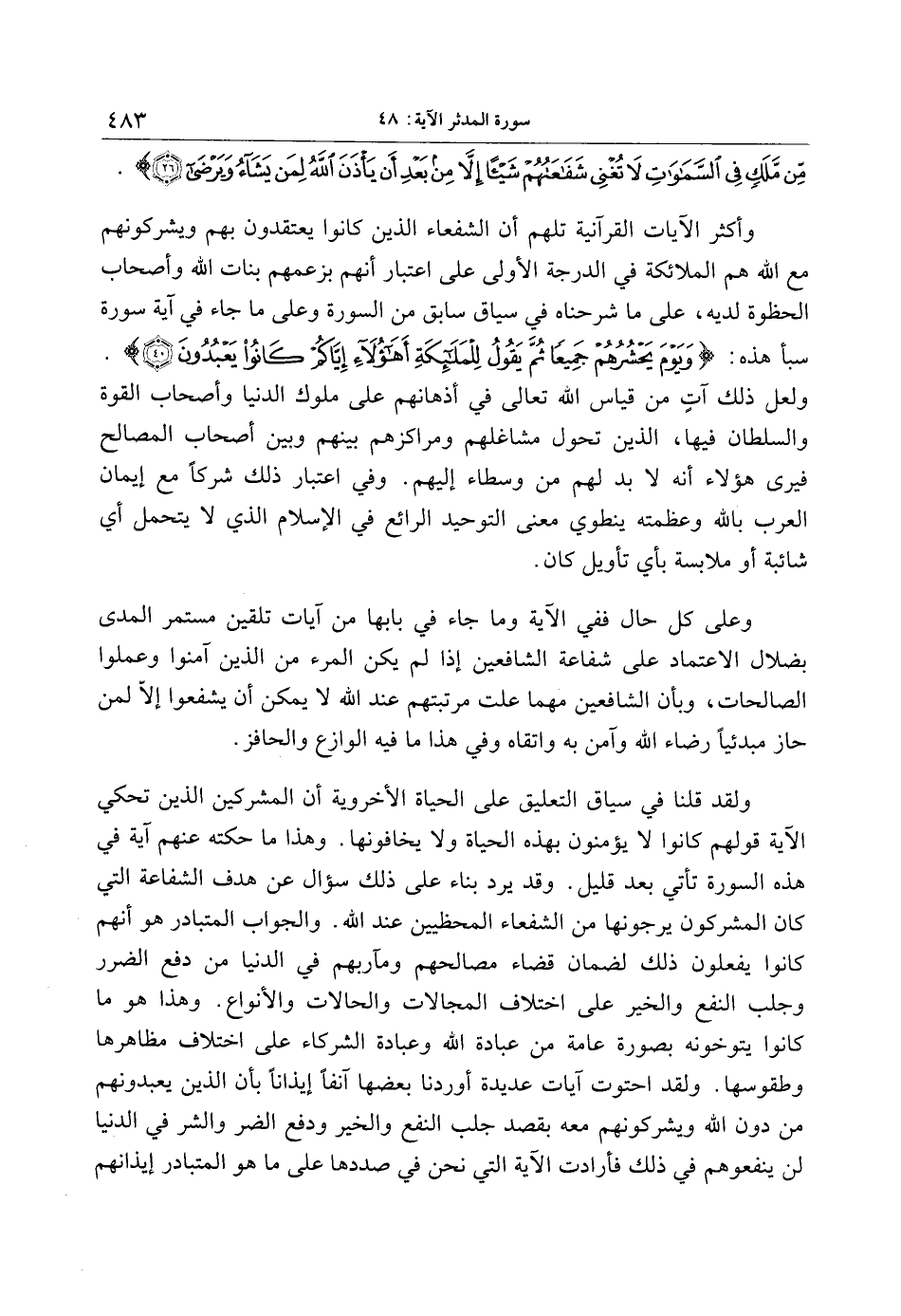 وعلى كل حال ففي الآية وما جاء في بابها من آيات تلقين مستمر المدى بضلال الاعتماد على شفاعة الشافعين إذا لم يكن المرء من الذين آمنوا وعملوا الصالحات، وبأن الشافعين مهما علت مرتبتهم عند الله لا يمكن أن يشفعوا إلّا لمن حاز مبدئيا رضاء الله وآمن به واتقاه وفي هذا ما فيه الوازع والحافز.