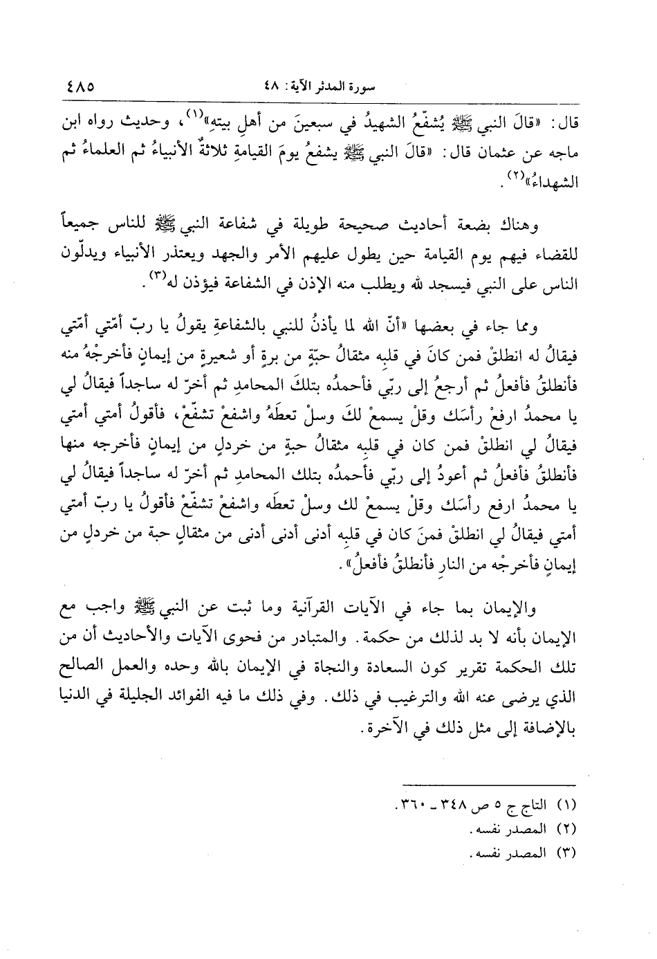 قال: «قال النبي صلّى الله عليه وسلّم يشفّع الشهيد في سبعين من أهل بيته» «1» ، وحديث رواه ابن ماجه عن عثمان قال: «قال النبي صلّى الله عليه وسلّم يشفع يوم القيامة ثلاثة الأنبياء ثم العلماء ثم الشهداء» «2» .