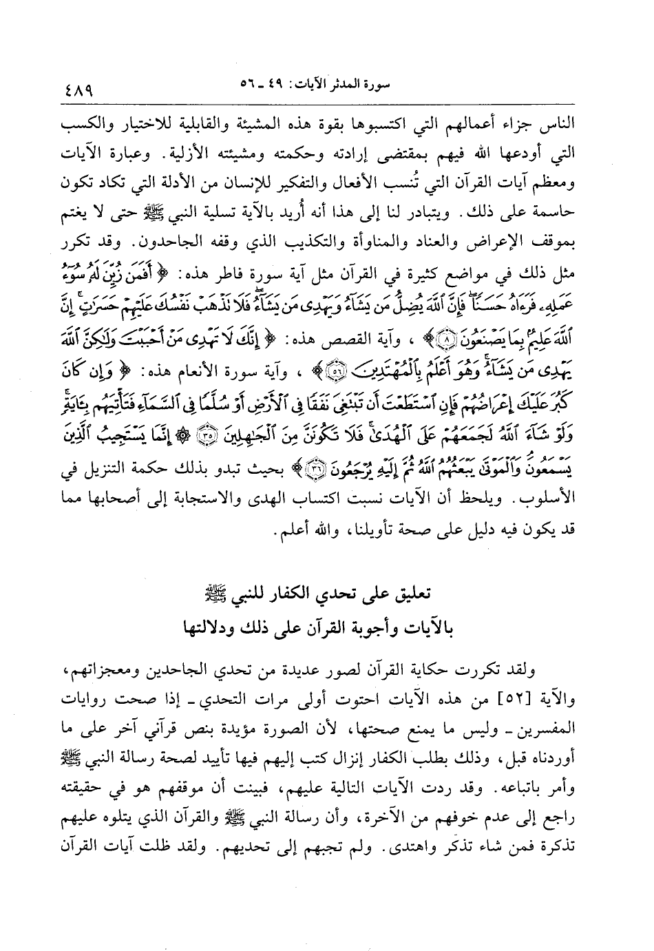 الناس جزاء أعمالهم التي اكتسبوها بقوة هذه المشيئة والقابلية للاختيار والكسب التي أودعها الله فيهم بمقتضى إرادته وحكمته ومشيئته الأزلية. وعبارة الآيات ومعظم آيات القرآن التي تنسب الأفعال والتفكير للإنسان من الأدلة التي تكاد تكون حاسمة على ذلك. ويتبادر لنا إلى هذا أنه أريد بالآية تسلية النبي صلّى الله عليه وسلّم حتى لا يغتم بموقف الإعراض والعناد والمناوأة والتكذيب الذي وقفه الجاحدون. وقد تكرر مثل ذلك في مواضع كثيرة في القرآن مثل آية سورة فاطر هذه: أَفَمَنْ زُيِّنَ لَهُ سُوءُ عَمَلِهِ فَرَآهُ حَسَناً فَإِنَّ اللَّهَ يُضِلُّ مَنْ يَشاءُ وَيَهْدِي مَنْ يَشاءُ فَلا تَذْهَبْ نَفْسُكَ عَلَيْهِمْ حَسَراتٍ إِنَّ اللَّهَ عَلِيمٌ بِما يَصْنَعُونَ (8) ، وآية القصص هذه: إِنَّكَ لا تَهْدِي مَنْ أَحْبَبْتَ وَلكِنَّ اللَّهَ يَهْدِي مَنْ يَشاءُ وَهُوَ أَعْلَمُ بِالْمُهْتَدِينَ (56) ، وآية سورة الأنعام هذه: وَإِنْ كانَ كَبُرَ عَلَيْكَ إِعْراضُهُمْ فَإِنِ اسْتَطَعْتَ أَنْ تَبْتَغِيَ نَفَقاً فِي الْأَرْضِ أَوْ سُلَّماً فِي السَّماءِ فَتَأْتِيَهُمْ بِآيَةٍ وَلَوْ شاءَ اللَّهُ لَجَمَعَهُمْ عَلَى الْهُدى فَلا تَكُونَنَّ مِنَ الْجاهِلِينَ (35) إِنَّما يَسْتَجِيبُ الَّذِينَ يَسْمَعُونَ وَالْمَوْتى يَبْعَثُهُمُ اللَّهُ ثُمَّ إِلَيْهِ يُرْجَعُونَ (36) بحيث تبدو بذلك حكمة التنزيل في الأسلوب. ويلحظ أن الآيات نسبت اكتساب الهدى والاستجابة إلى أصحابها مما قد يكون فيه دليل على صحة تأويلنا، والله أعلم.