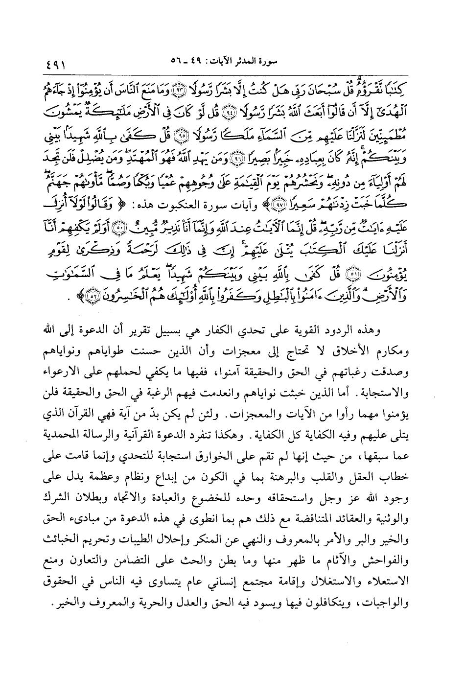 وهذه الردود القوية على تحدي الكفار هي بسبيل تقرير أن الدعوة إلى الله ومكارم الأخلاق لا تحتاج إلى معجزات وأن الذين حسنت طواياهم ونواياهم وصدقت رغباتهم في الحق والحقيقة آمنوا، ففيها ما يكفي لحملهم على الارعواء والاستجابة. أما الذين خبثت نواياهم وانعدمت فيهم الرغبة في الحق والحقيقة فلن يؤمنوا مهما رأوا من الآيات والمعجزات. ولئن لم يكن بدّ من آية فهي القرآن الذي يتلى عليهم وفيه الكفاية كل الكفاية. وهكذا تنفرد الدعوة القرآنية والرسالة المحمدية عما سبقها، من حيث إنها لم تقم على الخوارق استجابة للتحدي وإنما قامت على خطاب العقل والقلب والبرهنة بما في الكون من إبداع ونظام وعظمة يدل على وجود الله عز وجل واستحقاقه وحده للخضوع والعبادة والاتجاه وبطلان الشرك والوثنية والعقائد المتناقضة مع ذلك هم بما انطوى في هذه الدعوة من مبادئ الحق والخير والبر والأمر بالمعروف والنهي عن المنكر وإحلال الطيبات وتحريم الخبائث والفواحش والآثام ما ظهر منها وما بطن والحث على التضامن والتعاون ومنع الاستعلاء والاستغلال وإقامة مجتمع إنساني عام يتساوى فيه الناس في الحقوق والواجبات، ويتكافلون فيها ويسود فيه الحق والعدل والحرية والمعروف والخير.