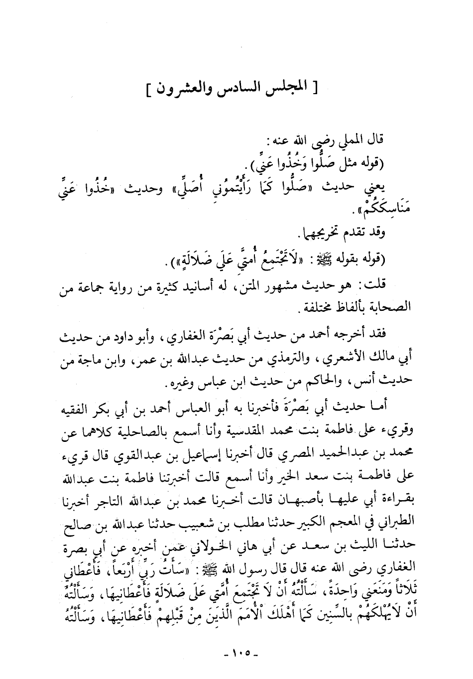 الغفاري رضي اللَّه عنه قال قال رسول اللَّه -صلى اللَّه عليه وسلم-: "سَأَلْتُ رَبِّي أَرْبَعًا، فَأَعْطَاني ثَلَاثًا وَمَنَعَني وَاحِدَةً، سَأَلْتُهُ أَنْ لَا تَجْتَمِعَ أَمَّتي عَلَى ضَلَالَةٍ فَأَعْطَانِيهَا، وَسَأَلْتُهُ أَنْ لَا يُهْلكَهُمْ بالسِّنِين كَمَا أَهْلَكَ الأُمَمَ الَّذيَنَ مِنْ قَبْلِهمْ فَأَعْطَانِيهَا، وَسَأَلْتُهُ
