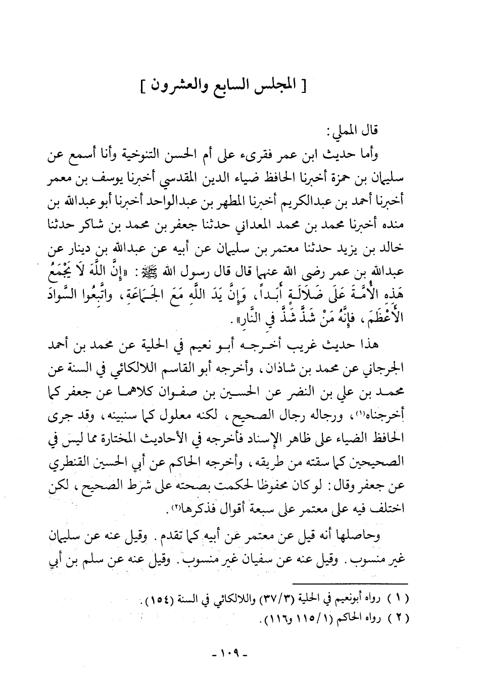 وأما حديث ابن عمر فقرئ على أم الحسن التنوخية وأنا أسمع عن سليمان بن حمزة أخبرنا الحافظ ضياء الدين المقدسي أخبرنا يوسف بن معمر أخبرنا أحمد بن عبد الكريم أخبرنا المطهر بن عبد الواحد أخبرنا أبو عبد اللَّه بن منده أخبرنا محمد بن محمد المعداني حدثنا جعفر بن محمد بن شاكر حدثنا خالد بن يزيد حدثنا معتمر بن سليمان عن أبيه عن عبد اللَّه بن دينار عن عبد اللَّه بن عمر رضي اللَّه عنهما قال قال رسول اللَّه -صلى اللَّه عليه وسلم-: "إِنَّ اللَّهَ لَا يَجْمَعُ هَذهِ الأُمَّةَ عَلَى ضَلَالَةٍ أَبَدًا، وَإِنَّ يَدَ اللَّهِ مَعَ الجَمَاعَةِ، واتَّبِعُوا السَّوادَ الأَعْظَمَ، فإِنَّهُ مَنْ شَذَّ شَذَّ فِي النَّارِ".