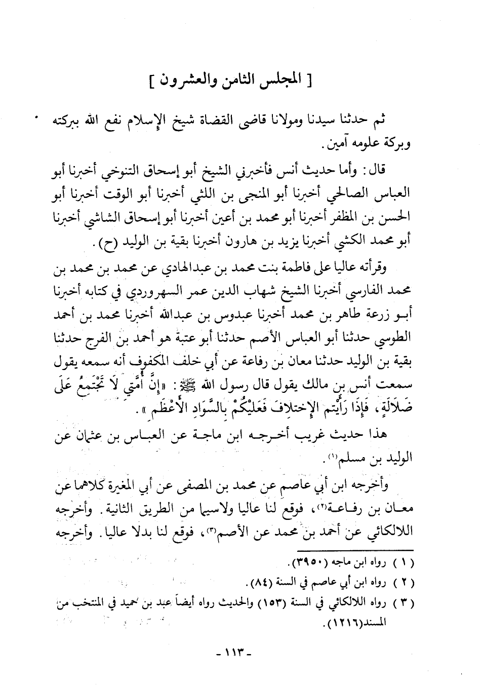 وقرأته عاليا على فاطمة بنت محمد بن عبد الهادي عن محمد بن محمد بن محمد الفارسي أخبرنا الشيخ شهاب الدين عمر السهروردي في كتابه أخبرنا أبو زرعة طاهر بن محمد أخبرنا عبدوس بن عبد اللَّه أخبرنا محمد بن أحمد الطوسي حدثنا أبو العباس الأصم حدثنا أبو عتبة هو أحمد بن الفرج حدثنا بقية بن الوليد حدثنا معان بن رفاعة عن أبي خلف المكفوف أنه سمعه يقول سمعت أنس بن مالك يقول قال رسول اللَّه -صلى اللَّه عليه وسلم-: "إِنَّ أُمَّتي لَا تَجْتَمِعُ عَلى ضَلَالَةٍ، فَإِذَا رَأَيْتم الإِختلِافَ فَعَليْكُمْ بالسَّوَادِ الأعْظَمِ".