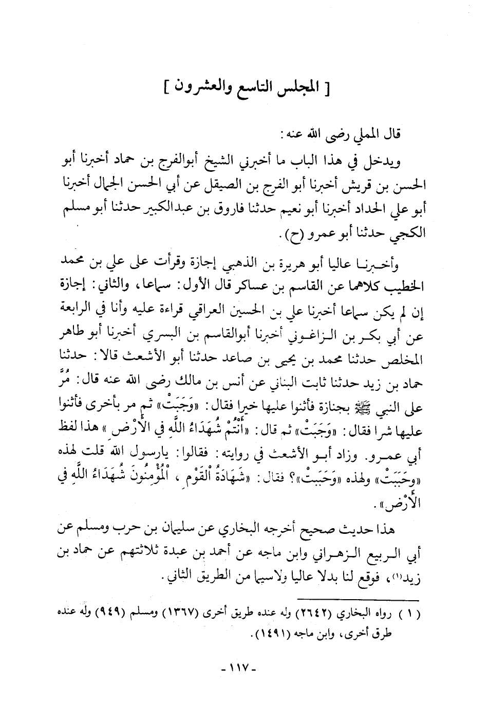وأخبرنا عاليا أبو هريرة بن الذهبي إجازة وقرأت على علي بن محمد الخطيب كلاهما عن القاسم بن عساكر قال الأول: سماعا، والثاني: إجازة إن لم يكن سماعا أخبرنا علي بن الحسين العراقي قراءة عليه وأنا في الرابعة عن أبي بكر بن الزاغوني أخبرنا أبو القاسم بن البسري أخبرنا أبو طاهر المخلص حدثنا محمد بن يحيى بن صاعد حدثنا أبو الأشعث قالا: حدثنا حماد بن زيد حدثنا ثابت البناني عن أنس بن مالك رضي اللَّه عنه قال: مُرَّ على النبي -صلى اللَّه عليه وسلم-بجنازة فأثنوا عليها خيرا فقال: "وَجَبَتْ" ثم مر بأخرى فأثنوا عليها شرا فقال: "وَجَبَتْ" ثم قال: "أَنْتُمْ شُهَدَاءُ اللَّهِ في الأَرْضِ" هذا لفظ أبي عمرو. وزاد أبو الأشعث في روايته: فقالوا: يارسول اللَّه قلت لهذه "وحَبَبَتْ" ولهذه "وَحَبَبتْ"؟ فقال: "شَهَادَةُ الْقَوْمِ، المُؤْمِنُونَ شُهَدَاءُ اللَّهِ في الأَرْض".