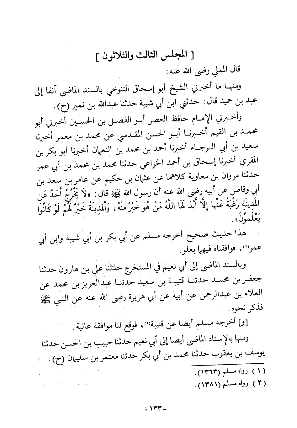وأخبرني الإِمام حافظ العصر أبو الفضل بن الحسين أخبرني أبو محمد بن القيم أخبرنا أبو الحسن المقدسي عن محمد بن معمر أخبرنا سعيد بن أبي الرجاء أخبرنا أحمد بن محمد بن النعمان أخبرنا أبو بكر بن المقري أخبرنا إسحاق بن أحمد الخزاعي حدثنا محمد بن محمد بن أبي عمر حدثنا مروان بن معاوية كلاهما عن عثمان بن حكيم عن عامر بن سعد بن أبي وِقاص عن أبيه رضي اللَّه عنه أن رسول اللَّه -صلى اللَّه عليه وسلم- قال: "لَا يَخْرُجُ أَحَدٌ عَنِ المَدِينة رَغْبَةً عَنْها إِلَّا أَبْدَ لَهَا اللَّهُ مَنْ هُوَ خَيْرٌ مِنْهُ، وَالْمدِينَةُ خَيْرٌ لَهُمْ لَوْ كَانُوَا يَعْلَموُنَ".
